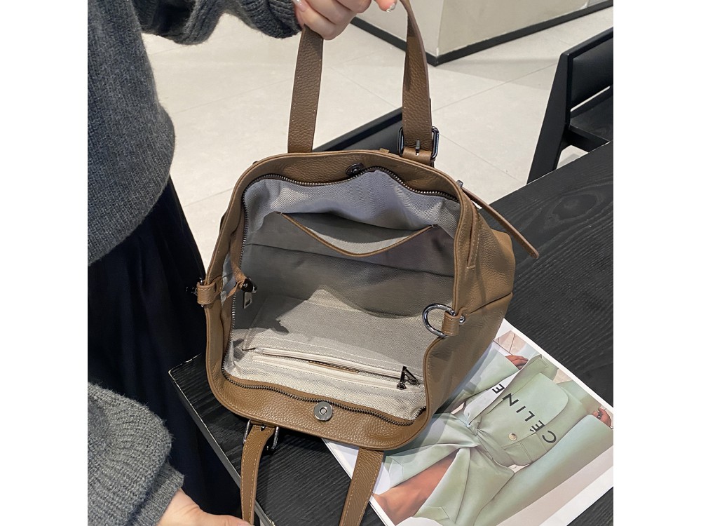 Одно основное отделение, внутри два надежных кармана на молнии для самых ценных предметов и один удобный открытый карман для легкого доступа к телефону, ключам и другим мелочам.