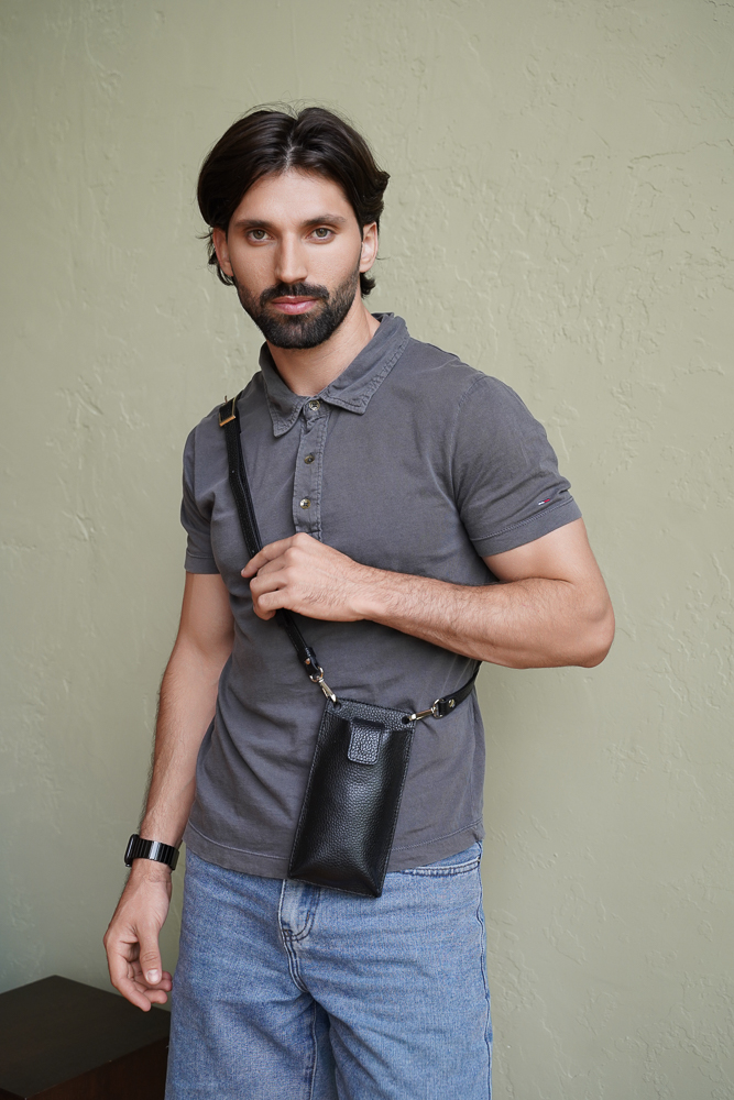 Сумка в стиле "unisex" для мобильного телефона регулируемым ремнем через плечо. Внутри сумки большое отделение для мобильного телефона, которое закрывается хлястиком на кнопке. На задней стенке карман для пластиковых карт. Идеальный вариант для прогулок и походов в магазин, компактная и стильная сумка через плечо для телефона и документов.