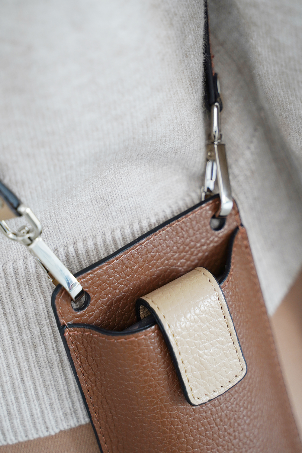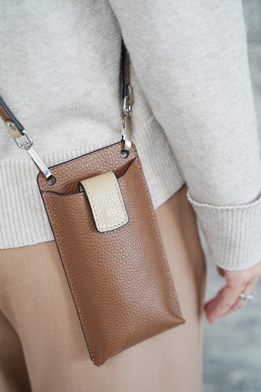Сумка для мобильного телефона регулируемым ремнем через плечо. Внутри сумки большое отделение для мобильного телефона, которое закрывается хлястиком на кнопке. На задней стенке карман для пластиковых карт. Идеальный вариант для прогулок и походов в магазин, компактная и стильная сумка через плечо для телефона и документов.