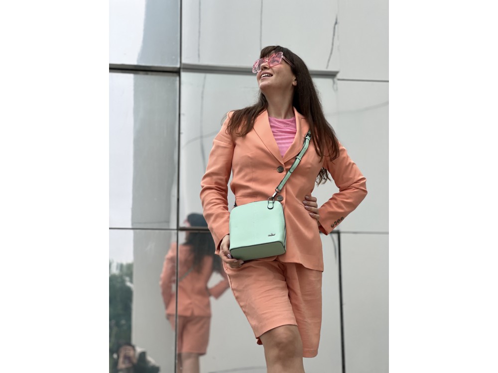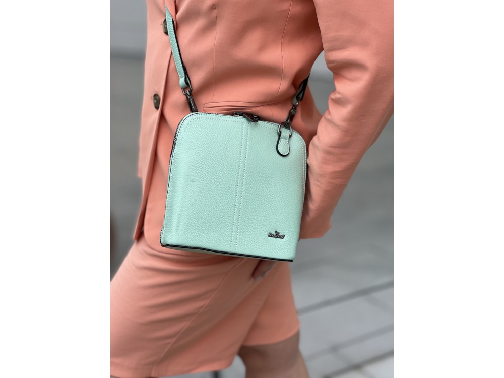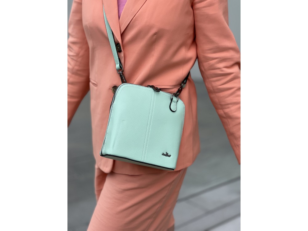 Белый цвет с легким эффектом перламутра. В комплекте длинный ремень с возможностью регулировки. Внутри: два отделения, между ними перегородка в виде кармана на молнии. Дополнительно два кармана для аксессуаров, один из которых застегивается на молнию. Снаружи: сзади карман для мелочей на молнии.