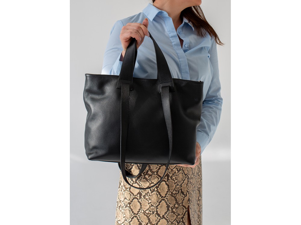 Сумка шоппер с 4 ручками, благодаря которым можно носить сумку на плече и в руках. Внутри сумки 2 основных отделения, которые разделяет дополнительное оттеление на молнии. В отделениях дополнительные карманы для мелочей.
