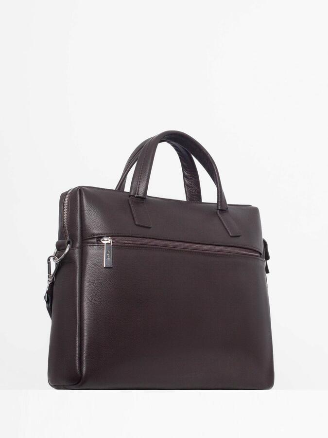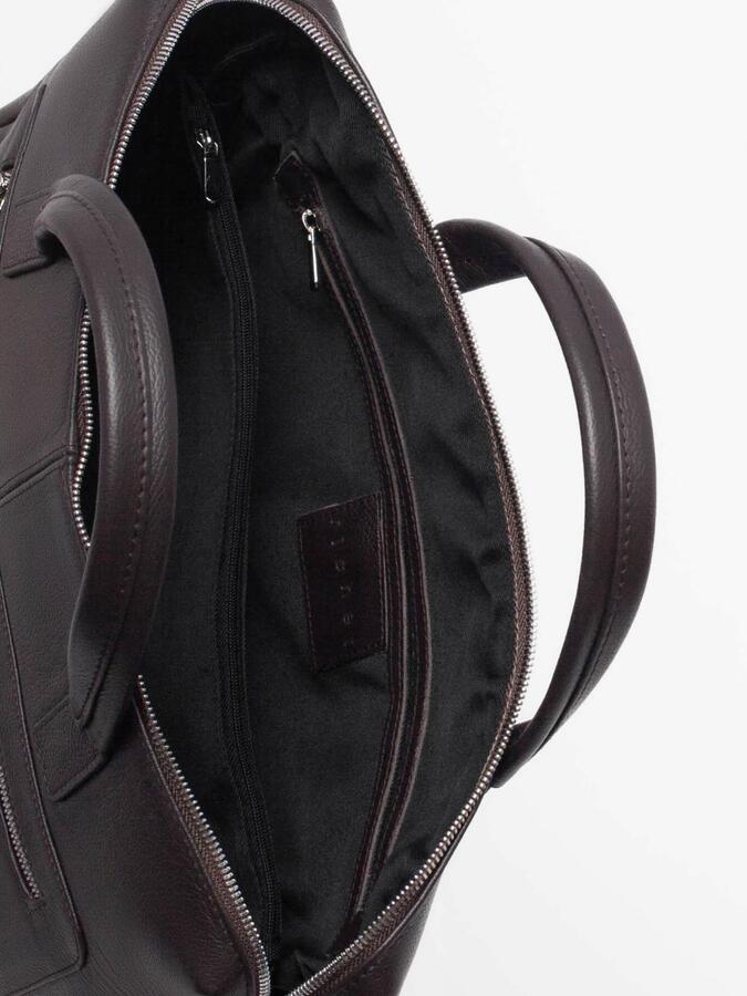 Внутри: Два отдела, разделенных подвесным карманом на молнии. На задней стенке - карман на молнии для документов. На передней стенке- один большой открытый карман, на котором распложены 2 открытых кармашка для мелочей и 2 держателя для ручек, выполненные из кожи.