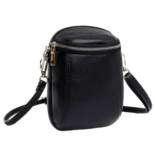 Внутри: два самостоятельных отделения на молнии, в которые поместятся телефон стандартных размеров, документы и различные необходимые мелочи. В комплекте удлинённый отстёгиваемый кожаный ремень.