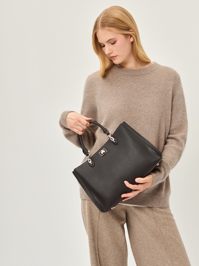 Женская сумка торговой марки Labbra из натуральной кожи. Модель застегивается на молнию, по бокам имеются два отделения на магнитной кнопке и с поворотным замком. Центральное отделение закрывается на металлическую молнию и содержит внутри карман на молнии и открытый карман. Два дополнительных отделения закрываются на магнитные кнопки и имеет карман на молнии. Высота ручек - 14 см. Длина регулируемого съемного плечевого ремня из натуральной кожи - 90 см, ширина - 1,8 см. Модель имеет ножки на дне. Не вмещает формат А4.