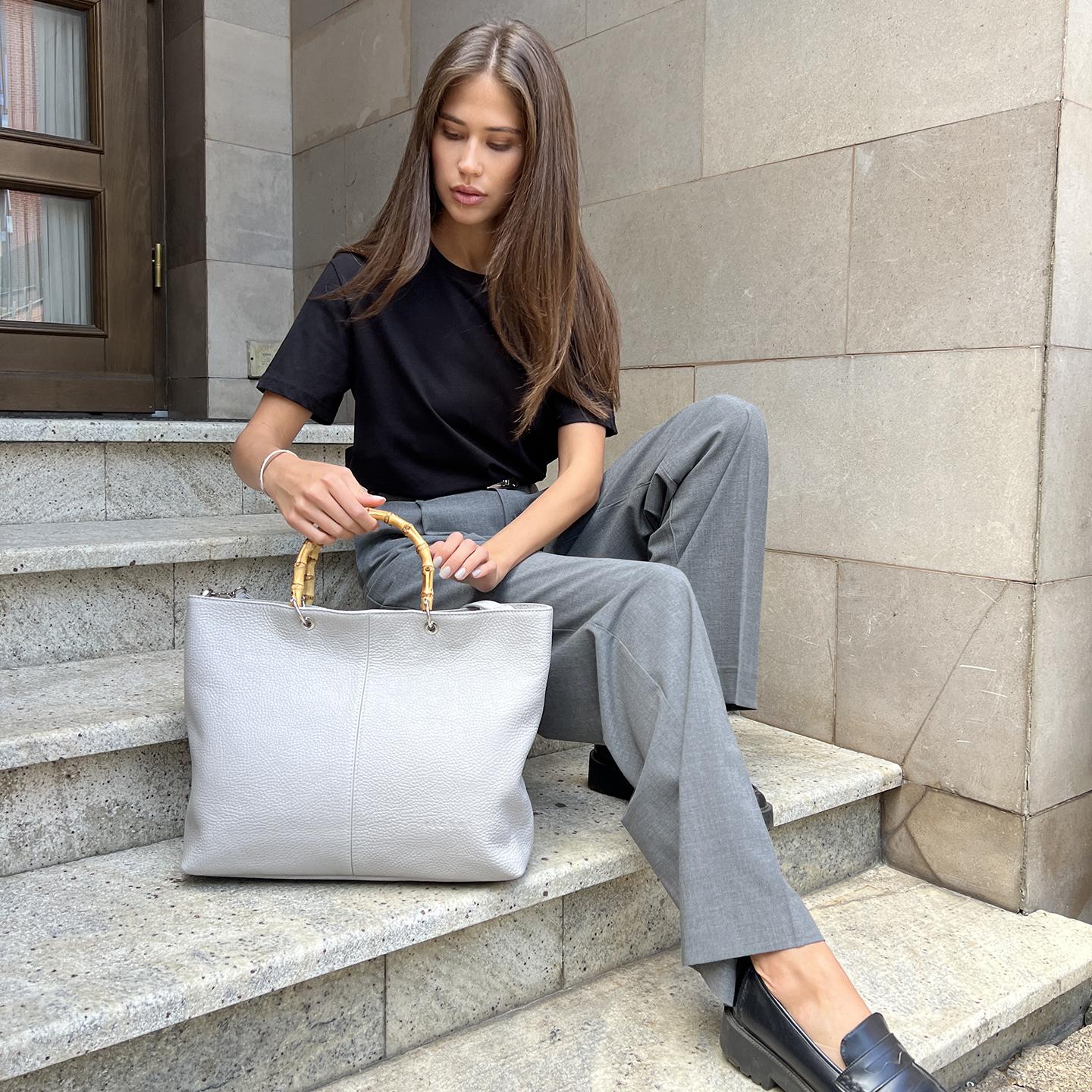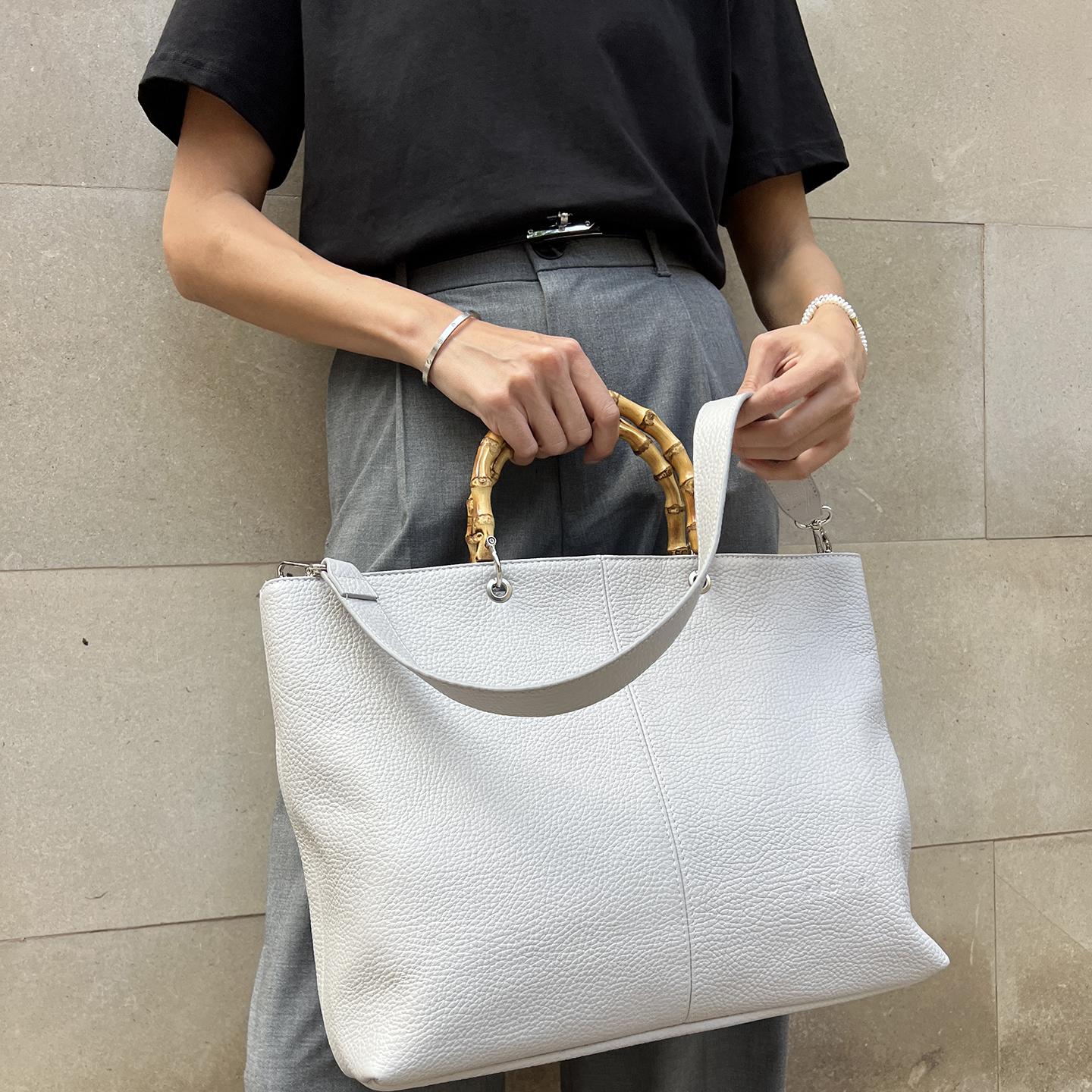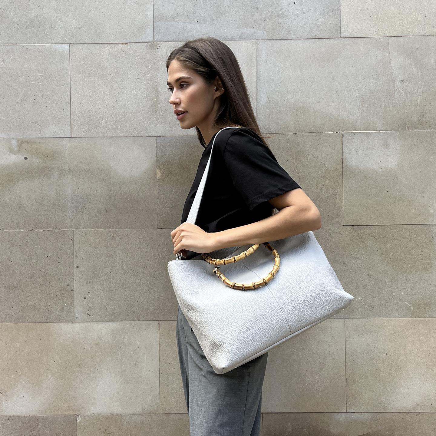 Вместительная сумка-тоут с ручками из натурального обожжённого бамбука из 100% кожи от Richet, закрывается на молнию, носится на плече или в руке.