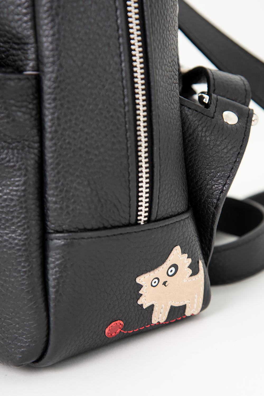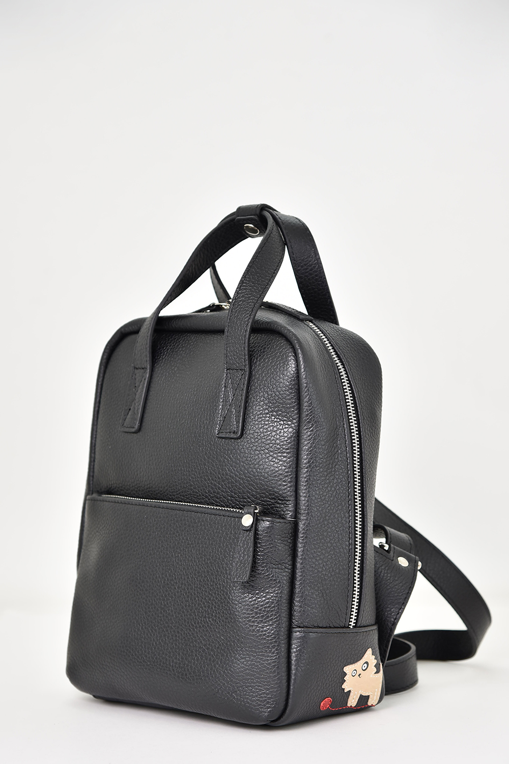 Сумка-рюкзак женская среднего размера. С аппликацией "Кот Тим". Рюкзак застегивается на молнию и имеет одно отделение. На передней стенке расположен карман на молнии. На задней стенке также есть карман на молнии. Лямки рюкзака регулируются по длине. Сумка-рюкзак на подкладке. Внутри сумки расположен карман на молнии из плотного материала и карман на молнии.