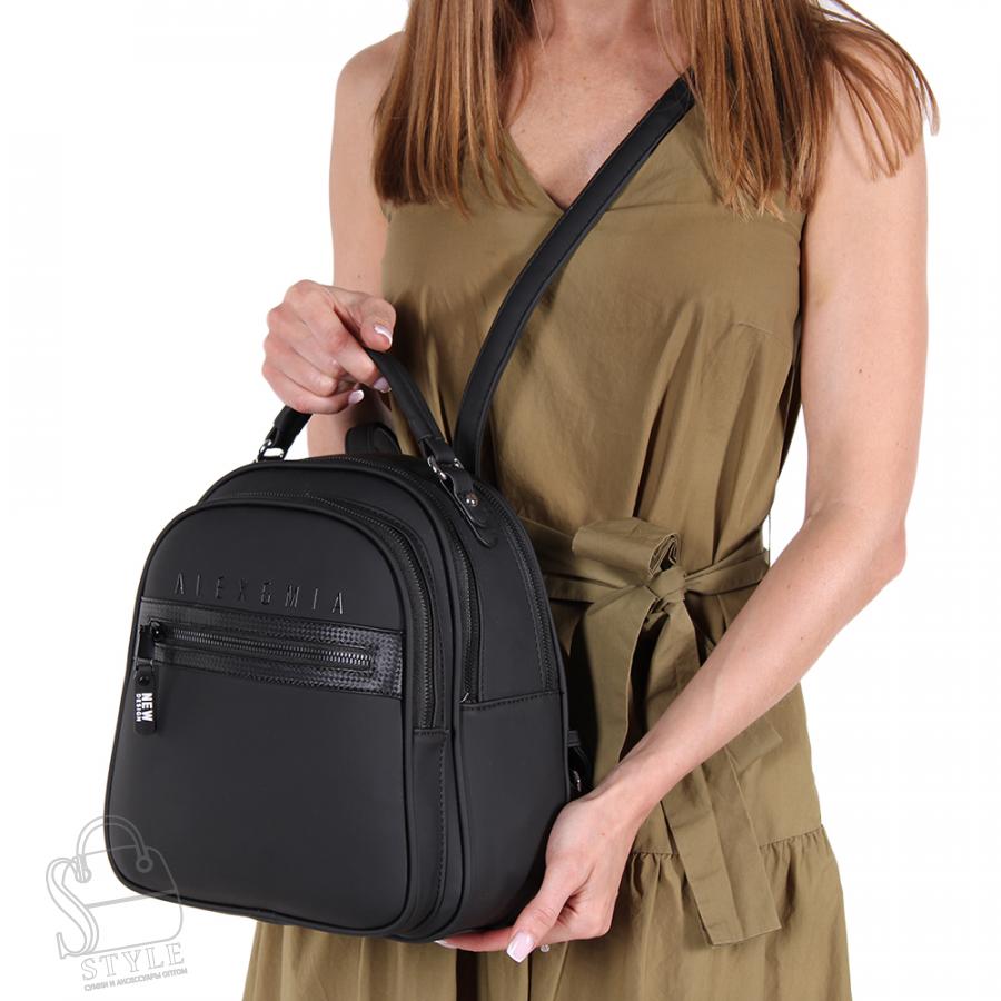 Рюкзак, выполнен из матовой экокожи.  Дополнен серебристой фурнитурой. Данная модель закрывается на молнию. Каркас полужесткий. Носится в руке или на плече.