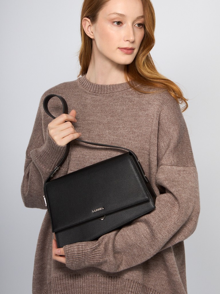 Женская сумка торговой марки Labbra из натуральной кожи. Модель закрывается на клапан с замком и имеет внутри пять отделений, четыре отделения для пластиковых карт и карман на молнии. Высота регулируемой ручки - 24 см. Модель не имеет ножки на дне.