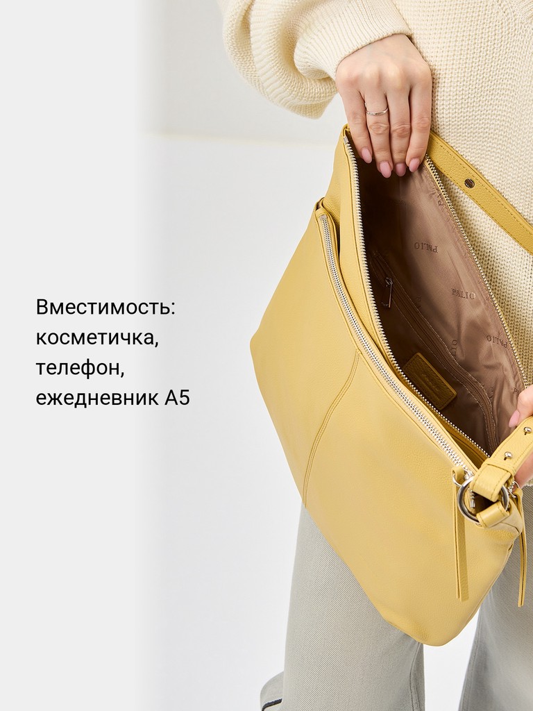 Женская сумка торговой марки Palio из натуральной кожи. Модель застегивается на молнии и магнитную кнопку. Содержит внутри три отдела. В одном отделе имеется карман на молнии, в другом – два открытых кармана. Высота съемной регулируемой ручки – 25 см. Максимальная длина съемного регулируемого плечевого ремня из текстиля - 120 см, ширина - 4 см. Модель не имеет ножки на дне. Не вмещает формат А4.