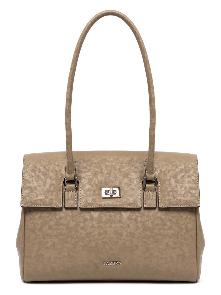 Женская сумка торговой марки Labbra из натуральной кожи. Модель закрывается клапаном на замок. Содержит внутри два отдела, между которыми имеется отделение на молнии. В одном отделе имеется карман на липучке, в другом - открытый карман. На задней стенке есть карман на молнии, в котором имеется петля из тесьмы для фиксации сумки на ручке чемодана. Высота ручек - 25 см. Модель имеет ножки на дне. Не вмещает формат А4.