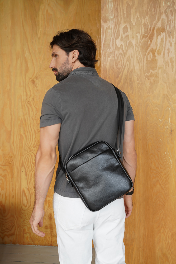 Сумка мужская с несъемным регулируемым ремнем-стропой через плечо. Сумка застегивается на молнию и имеет одно отделение. На передней стенке расположен карман на металлической молнии,на задней стенке-карман на магните. Сумка на подкладке. Внутри расположен карман на молнии и накладной карман для мобильного телефона и визиток.