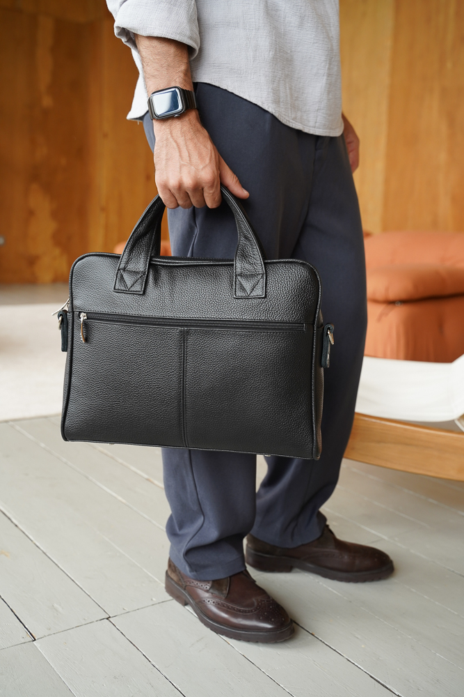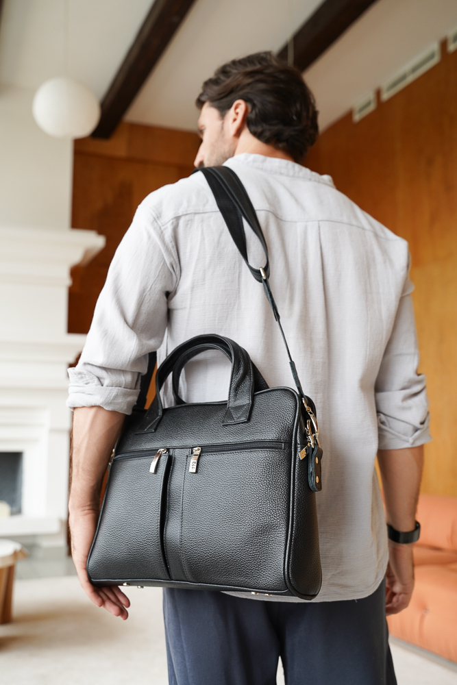 Сумка мужская со съемным регулируемым ремнем-стропой через плечо. При необходимости вмещает формат А4. Застегивается на молнию и имеет одно отделение, удобные прочные ручки. На передней стенке расположены функциональные накладные карманы на молнии. На задней стенке также есть карман на молнии. Сумка на подкладке. Внутри сумки расположен средник на молнии из плотного материала, два кармана на молнии и накладной карман для мобильного телефона и визиток.