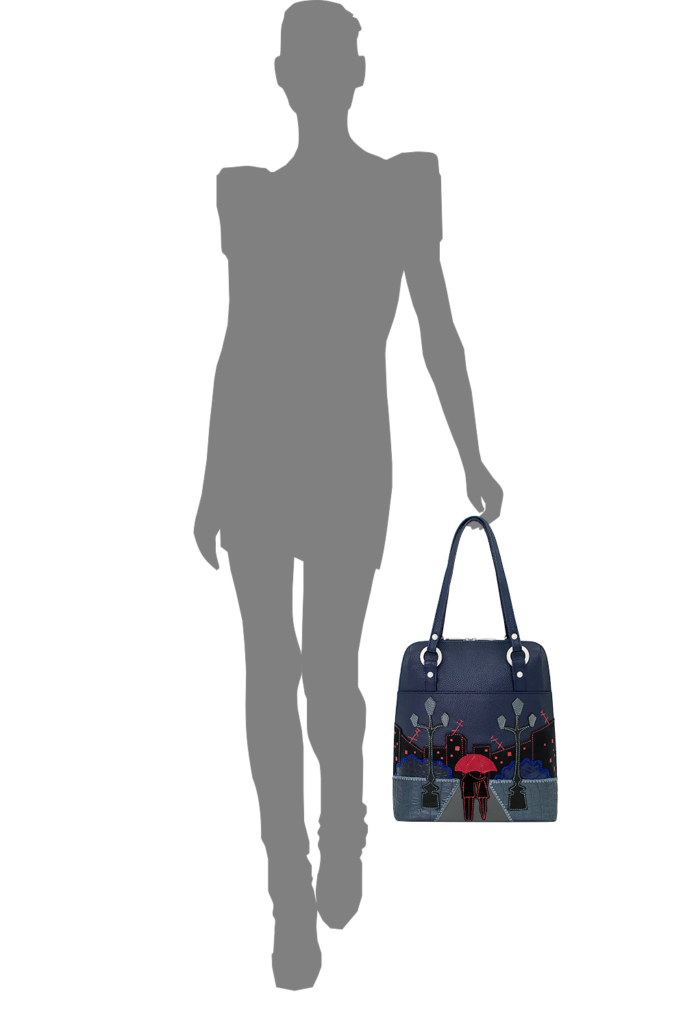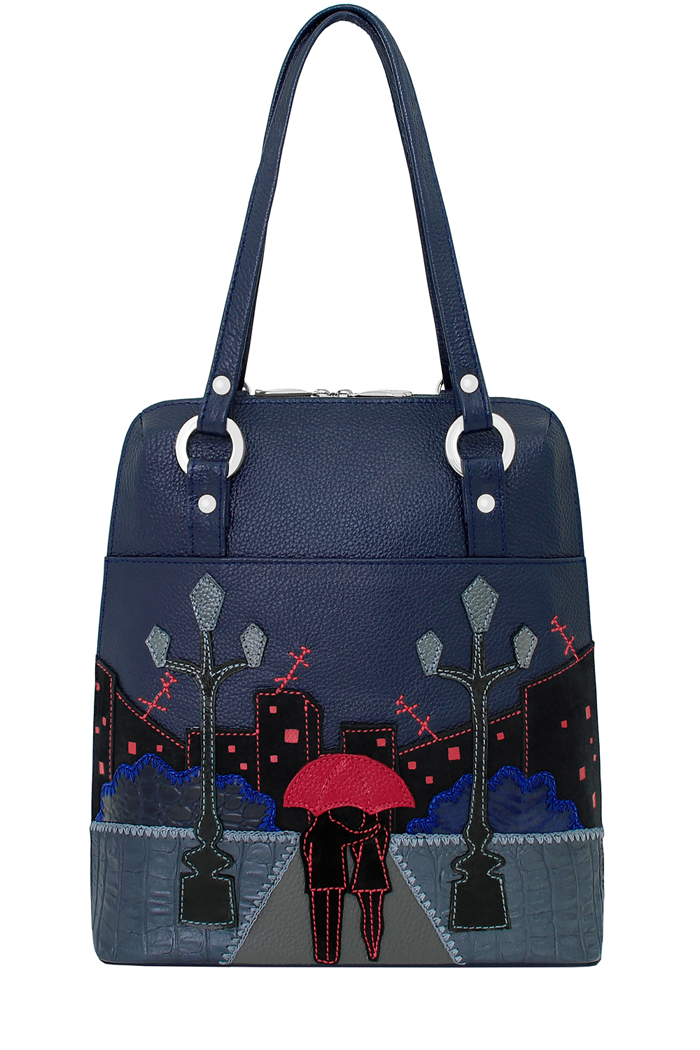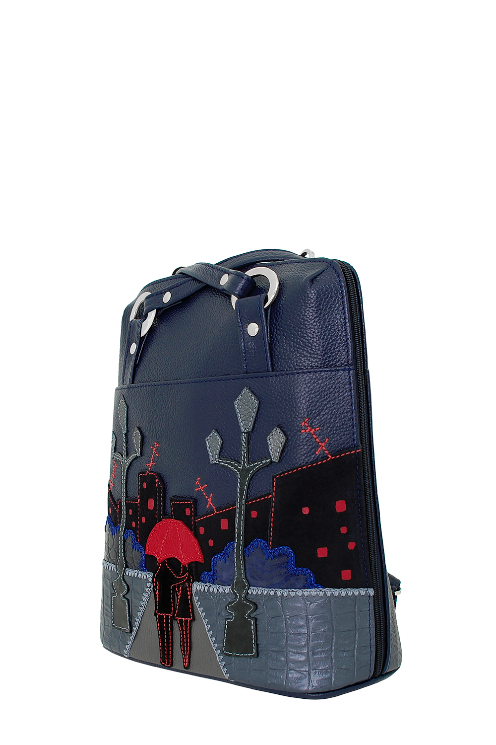 Сумка-трансформер женская с аппликацией "Город №24" и удлиненными ручками на плечо. Сумка застегивается на молнию и имеет одно отделение. Ручки сумки легко затягиваются в лямки рюкзака и регулируются по длине. Ручки имеют отделку металлической фурнитурой. На задней стенке расположен карман на молнии. Сумка-трансформер на подкладке. Внутри сумка имеет средник на молнии из плотной материала,карман на молнии и накладной карман для мобильного телефона и визиток.
