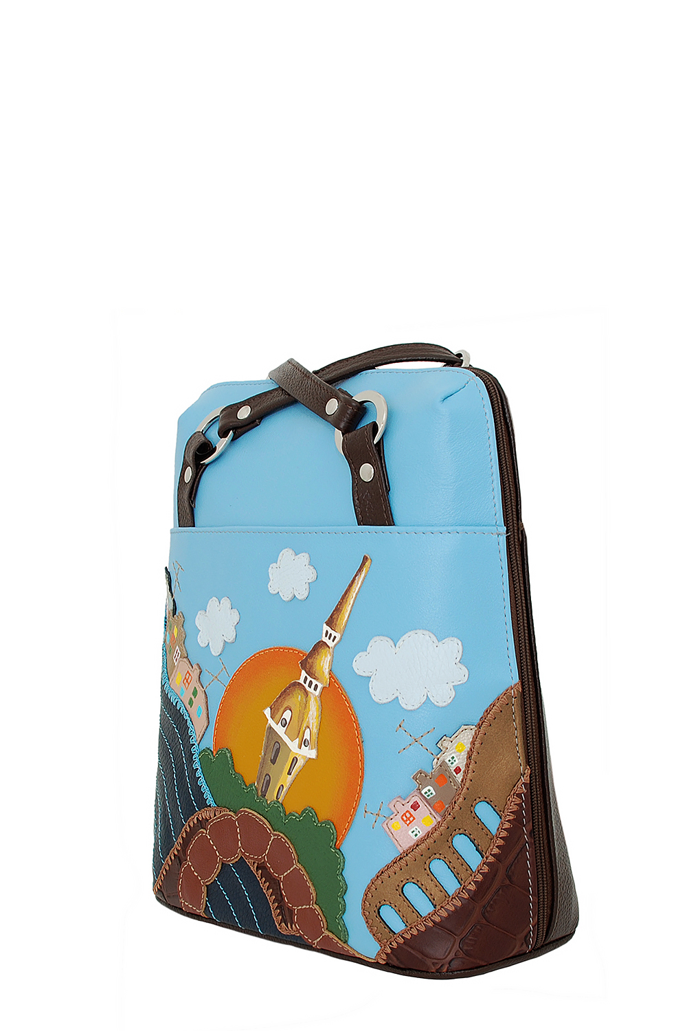 Сумка-трансформер женская с аппликацией "Город №13" и удлиненными ручками на плечо. Сумка застегивается на молнию и имеет одно отделение. Ручки сумки легко затягиваются в лямки рюкзака и регулируются по длине. Ручки имеют отделку металлической фурнитурой. На задней стенке расположен карман на молнии. Сумка-трансформер на подкладке. Внутри сумка имеет средник на молнии из плотной материала,карман на молнии и накладной карман для мобильного телефона и визиток.