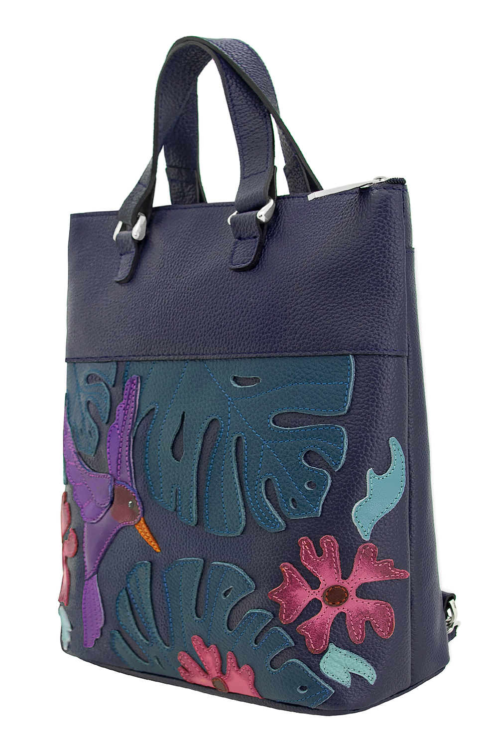 Сумка-рюкзак женская с аппликацией "КОЛИБРИ №1" среднего размера. При необходимости вмещает формат А4. Рюкзак застегивается на молнию и имеет одно отделение. На задней стенке также есть карман на молнии. Лямки рюкзака регулируются по длине, при необходимости их можно снять. Сумка-рюкзак на подкладке. Внутри сумки расположен карман на молнии из плотного материала и карман на молнии.
