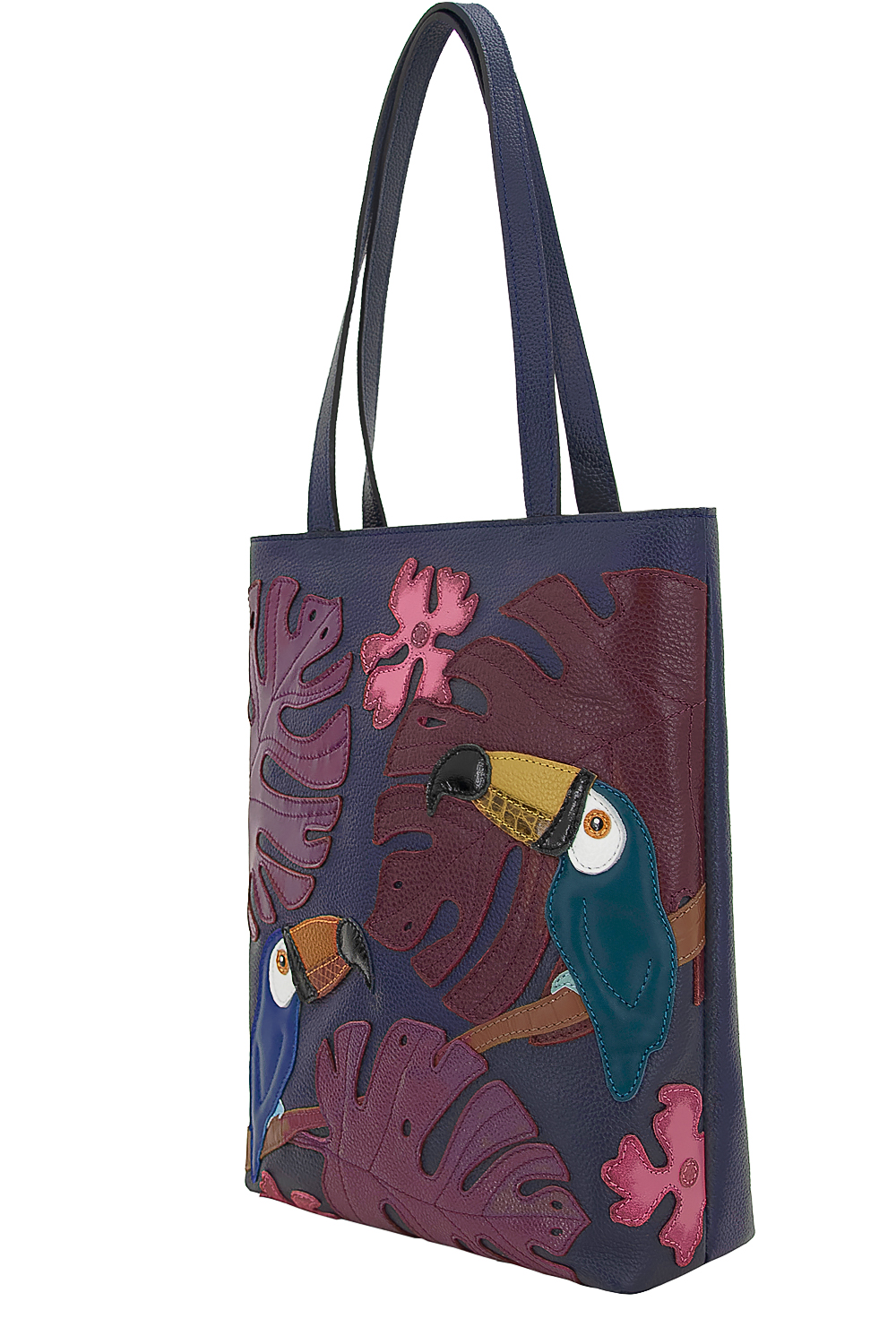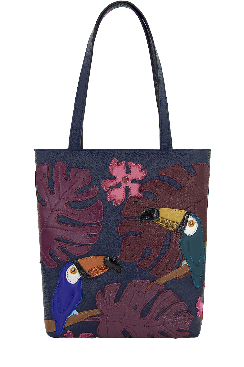 Сумка женская с аппликацией "ТУКАН N2" с удлиненными ручками на плечо. Сумка застегивается на молнию и имеет одно отделение. На задней стенке расположен карман на молнии. Сумка на подкладке. Внутри сумка имеет карман на молнии и карман на молнии из плотного материала.