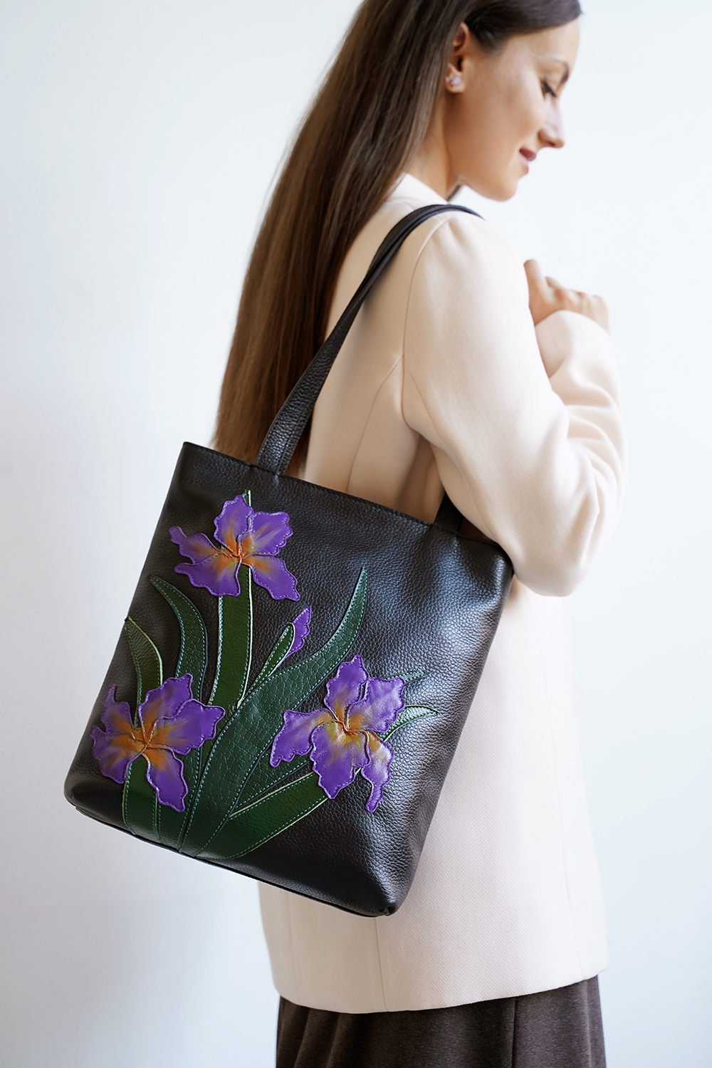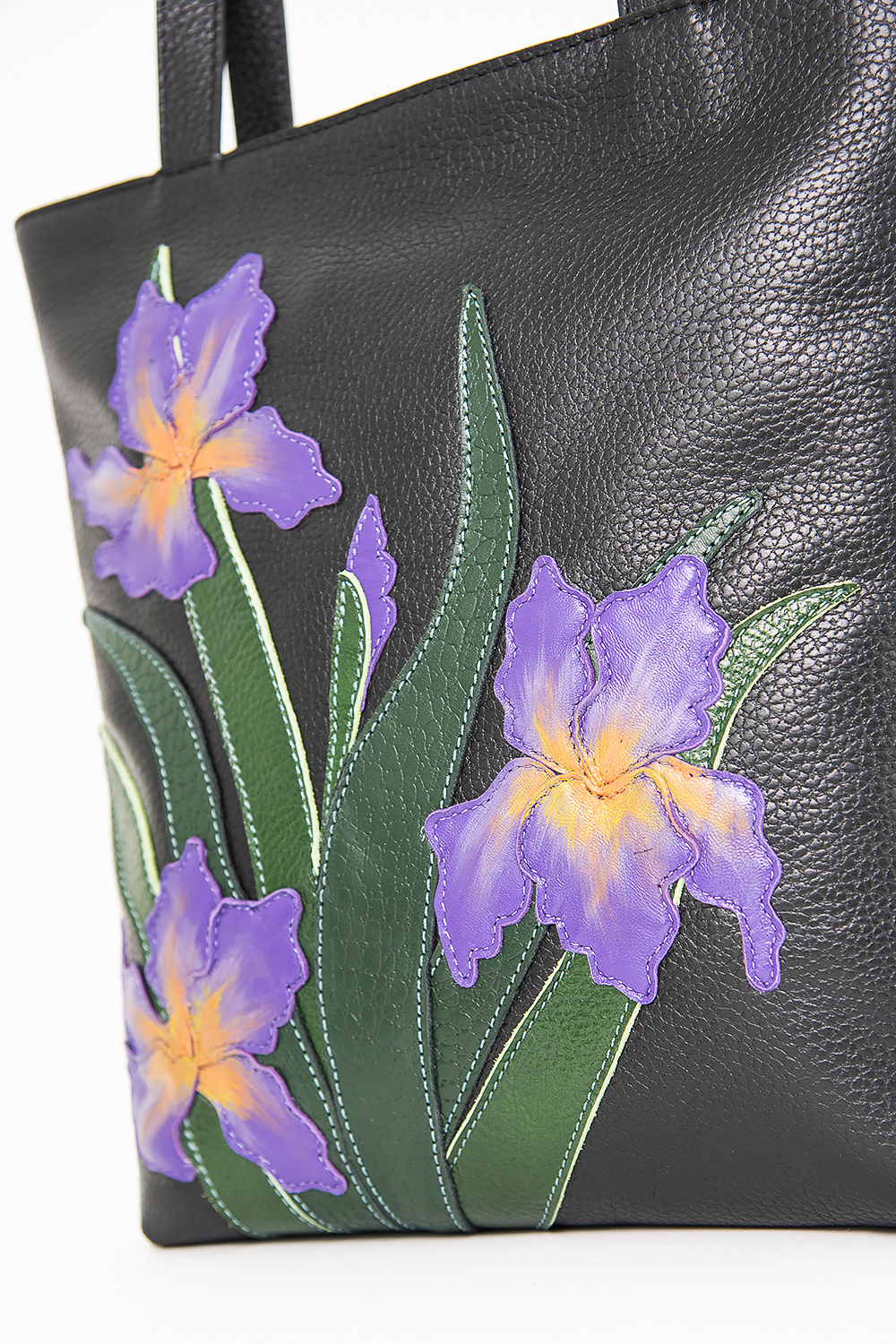 Сумка женская с аппликацией "Ирисы" с удлиненными ручками на плечо. Сумка застегивается на молнию и имеет одно отделение. На задней стенке расположен карман на молнии. Сумка на подкладке. Внутри сумка имеет карман на молнии и карман на молнии из плотного материала.