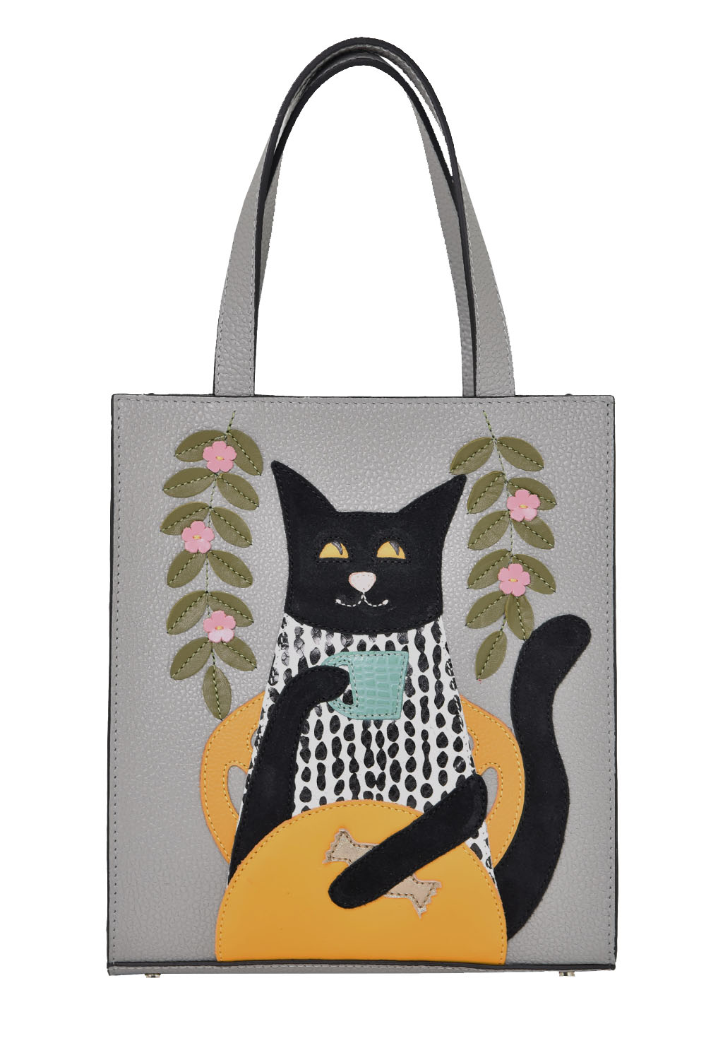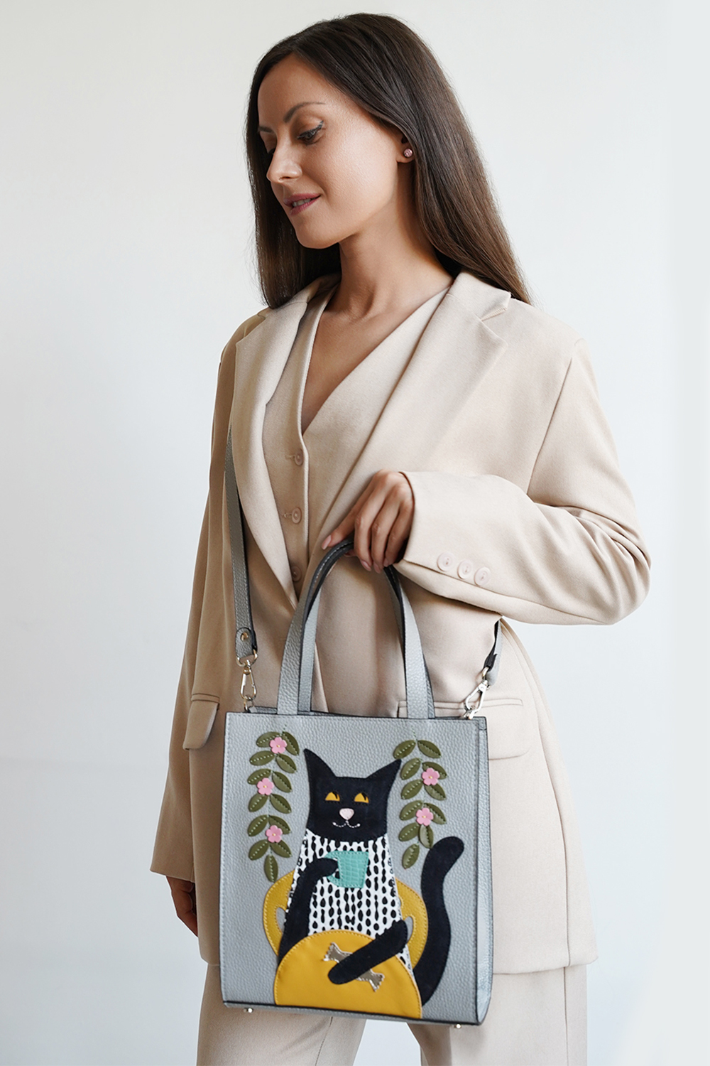 Сумка женская с аппликацией "Кот чаепитие" со съемным регулируемым ремнем через плечо, застегивается на молнию и имеет одно отделение. На задней стенке расположен карман на молнии. Сумка на подкладке. Внутри сумка имеет карман на молнии и карман накладной карман на молнии "карман в кармане" из плотного материала. Металлические ножки для защиты дна сумки
