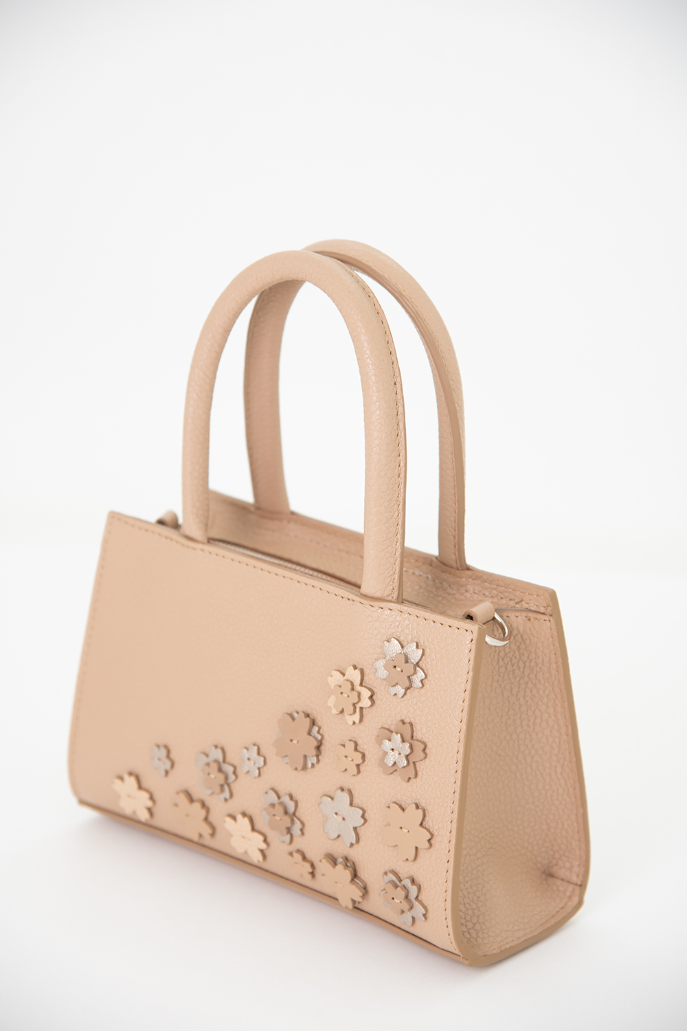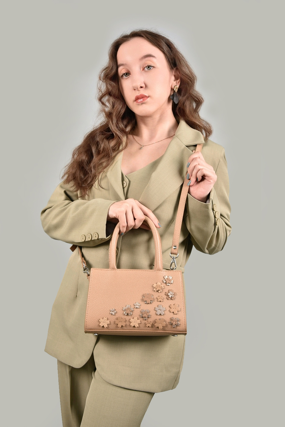 Сумка женская, с аппликацией "Цветы №2", жёсткой формы, со съемным регулируемым ремнем через плечо, на задней стенке изделия расположен накладной карман. Имеет одно отделение, закрывается на застёжку, на металлической молнии. Внутри карман на молнии. Сумка с подкладкой, и металлическими ножками для защиты дна. Сумка украшена цветами ручной работы.