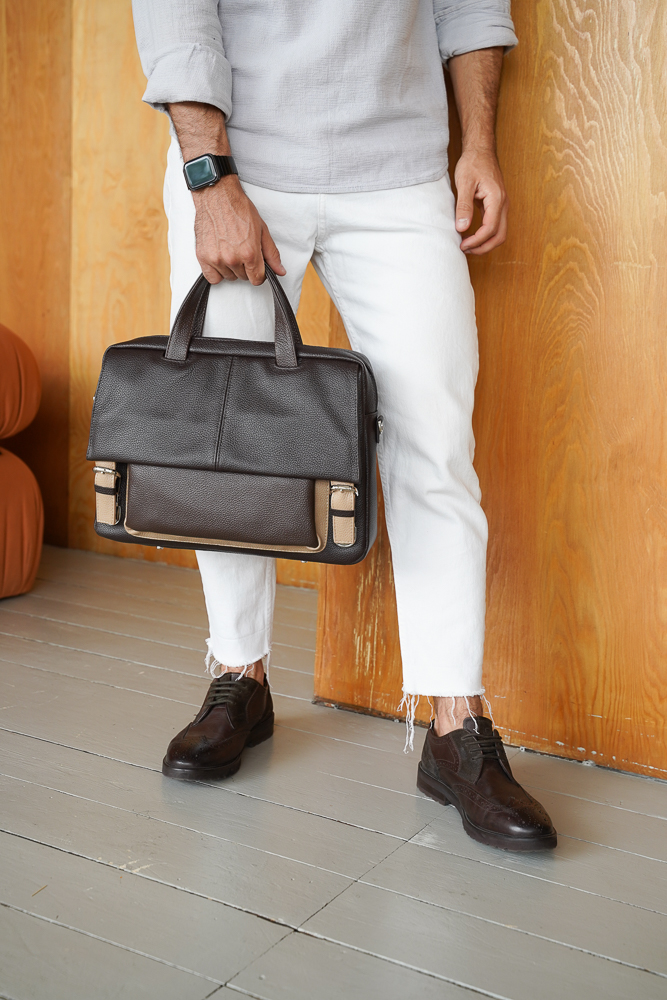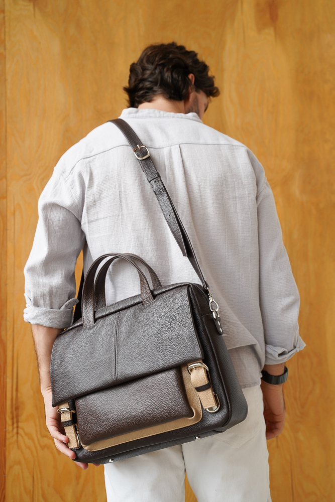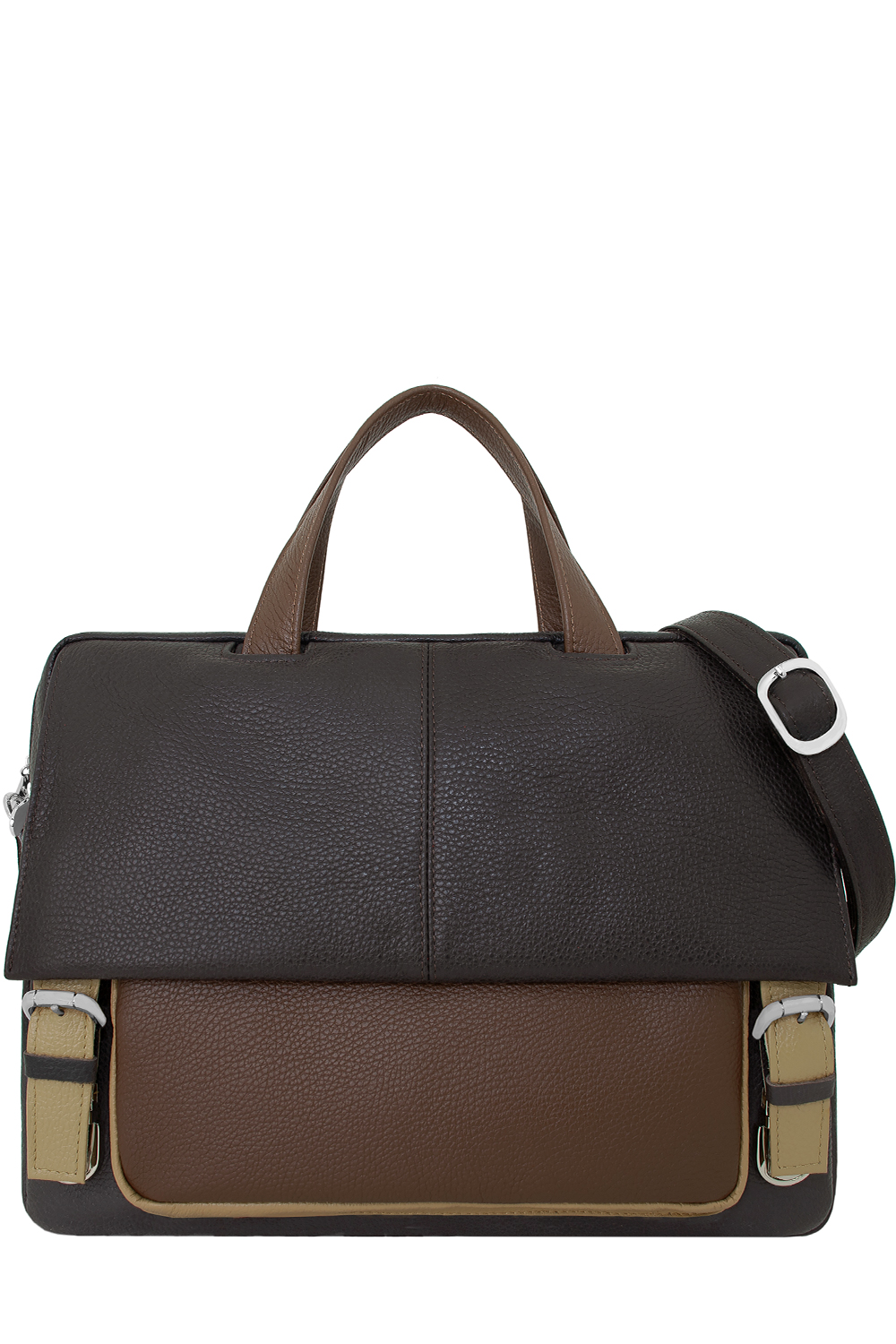Сумка в стиле "unisex" портфельного типа с короткими ручками. Имеет съемный регулируемый ремень через плечо. Закрывается на молнию и имеет одно отделение. На передней стенке расположен объемный карман на клапане с двумя замками, вмещающий Ipad. Основное отделение вмещает формат А4. На задней стенке расположен карман на молнии. Сумка на подкладке. Внутри расположены большой средник на молнии, карман на молнии, карман для мобильного телефона и визиток, накладной средник на молнии.