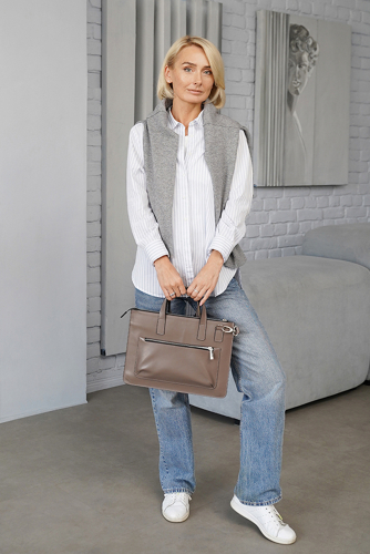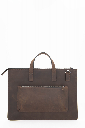 Сумка-папка в стиле "unisex"с короткими ручками. Имеет съемный регулируемый ремень через плечо. Закрывается на молнию и имеет одно отделение. На передней стенке расположен объемный карман на молнии, вмещающий зарядное устройство. Основное отделение вмещает формат А4 и ноутбук 15,6''