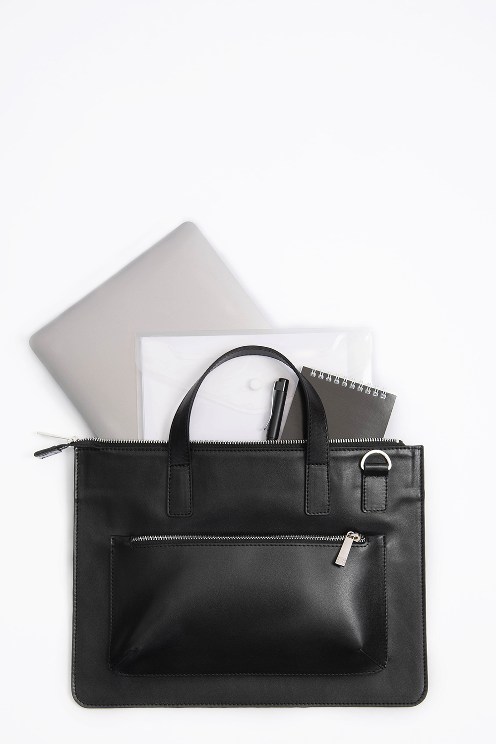 Сумка-папка в стиле "unisex"с короткими ручками. Имеет съемный регулируемый ремень через плечо. Закрывается на молнию и имеет одно отделение. На передней стенке расположен объемный карман на молнии, вмещающий зарядное устройство. Основное отделение вмещает формат А4 и MacBook