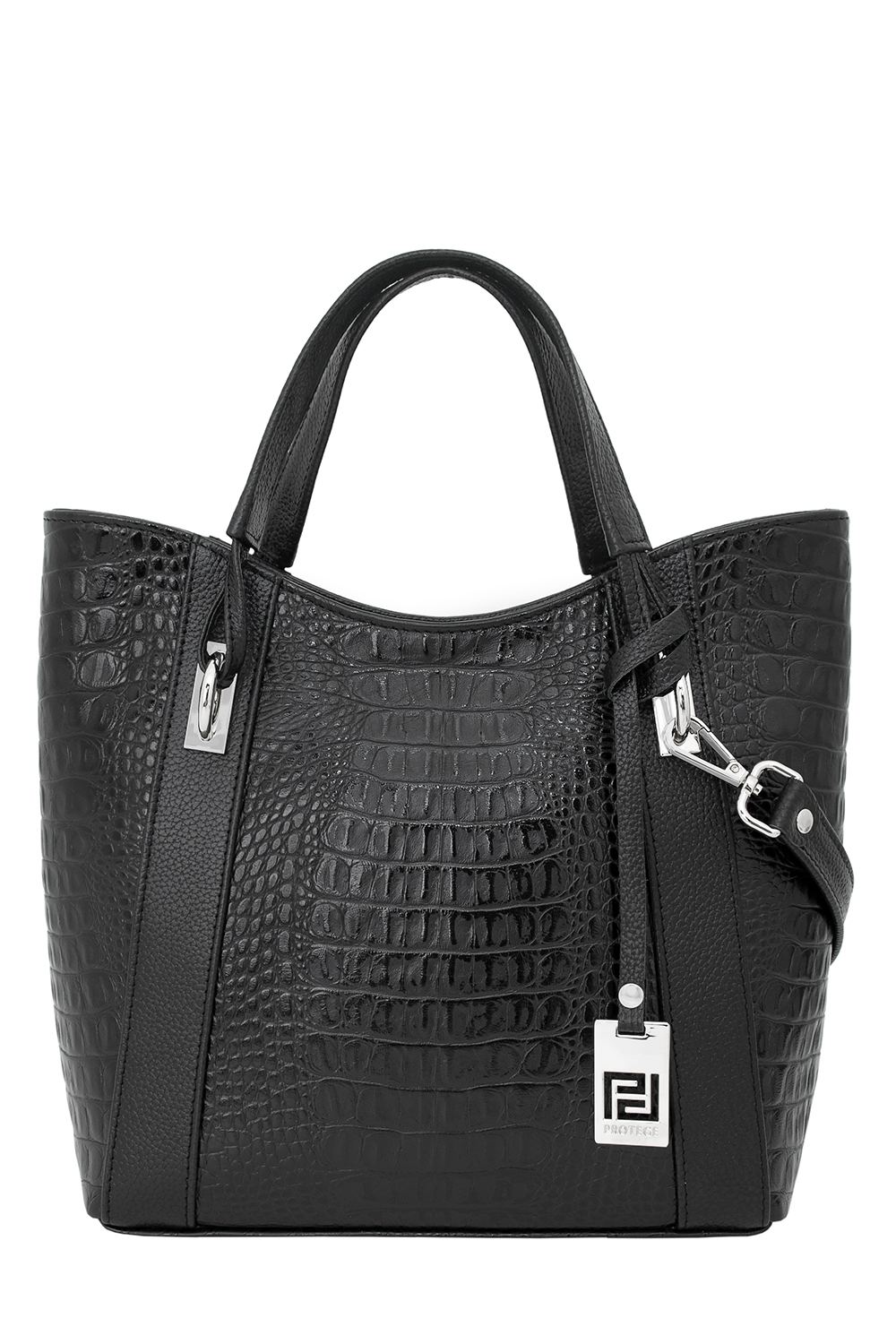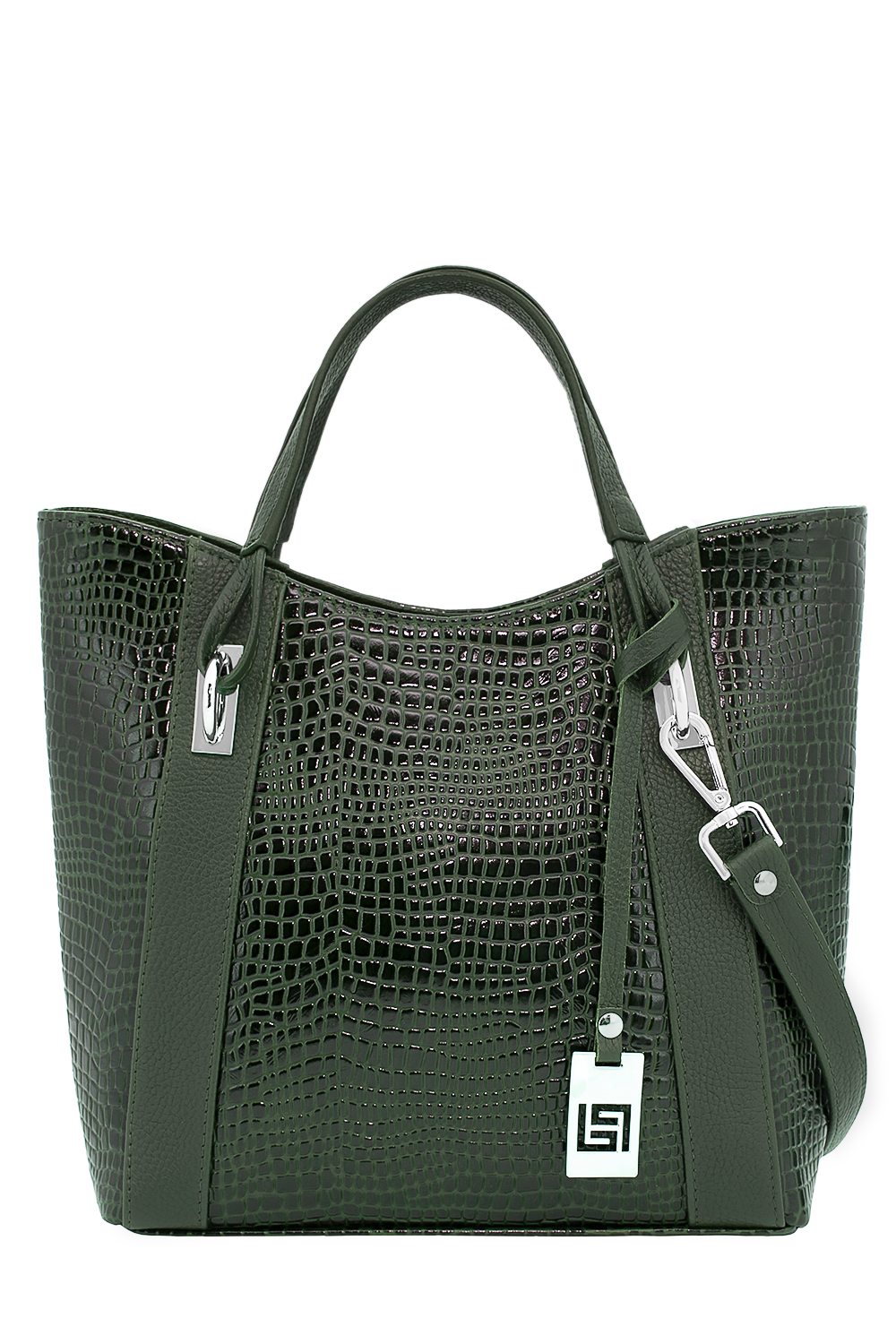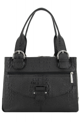 Сумка женская среднего размера со съемным регулируемым ремнем через плечо. Сумка застегивается на молнию и имеет одно отделение. На стенках сумки расположены короткие ручки на металлической фурнитуре. На задней стенке расположен карман на молнии. Сумка на подкладке. Внутри расположены средник на молнии из плотного материала,боковой карман на молнии и накладной карман для мобильного телефона и визиток.