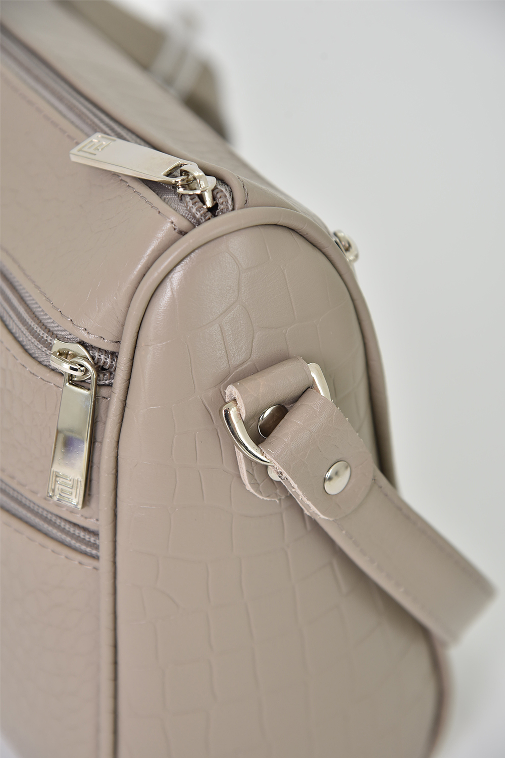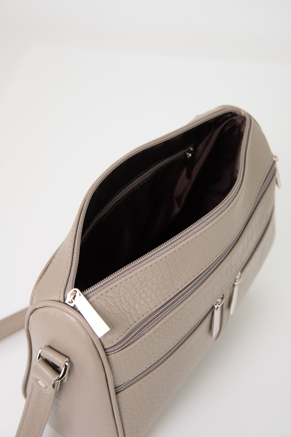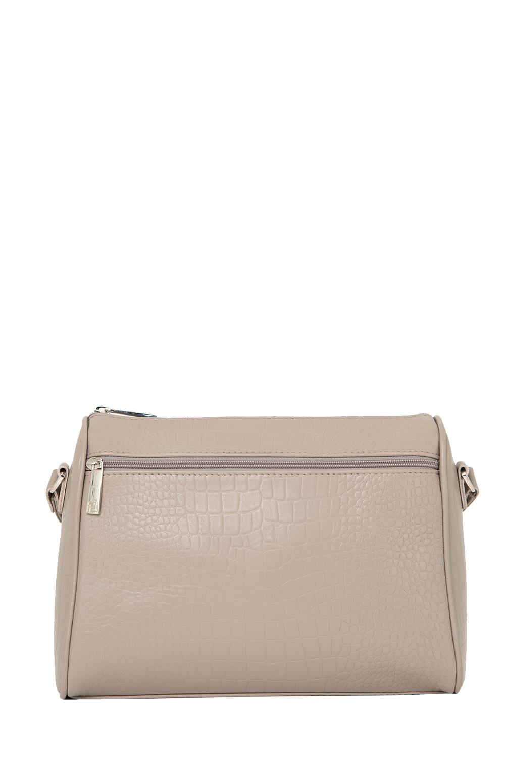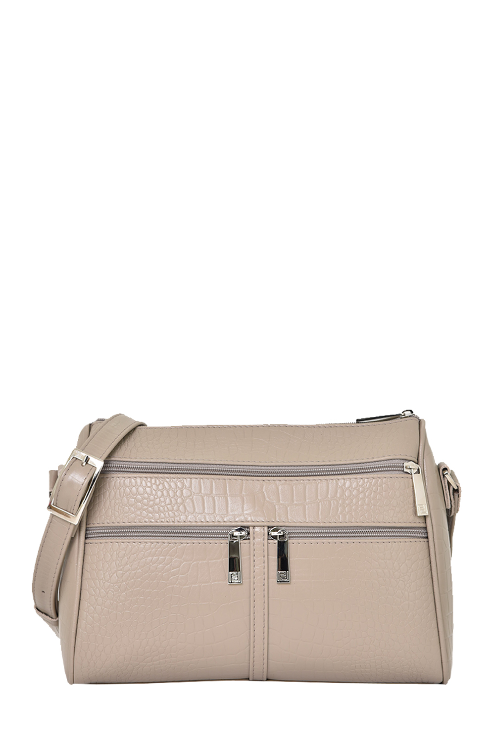 Сумка женская среднего размера с несъемным регулируемым ремнем через плечо. Сумка застегивается на молнию и имеет одно отделение. На передней стенке расположены один большой верхний карман на молнии и два маленьких нижних кармана на молнии. На задней стенке также есть карман на молнии. Сумка на подкладке. Внутри сумка имеет карман на молнии, накладной карман для мобильного телефона и визиток.