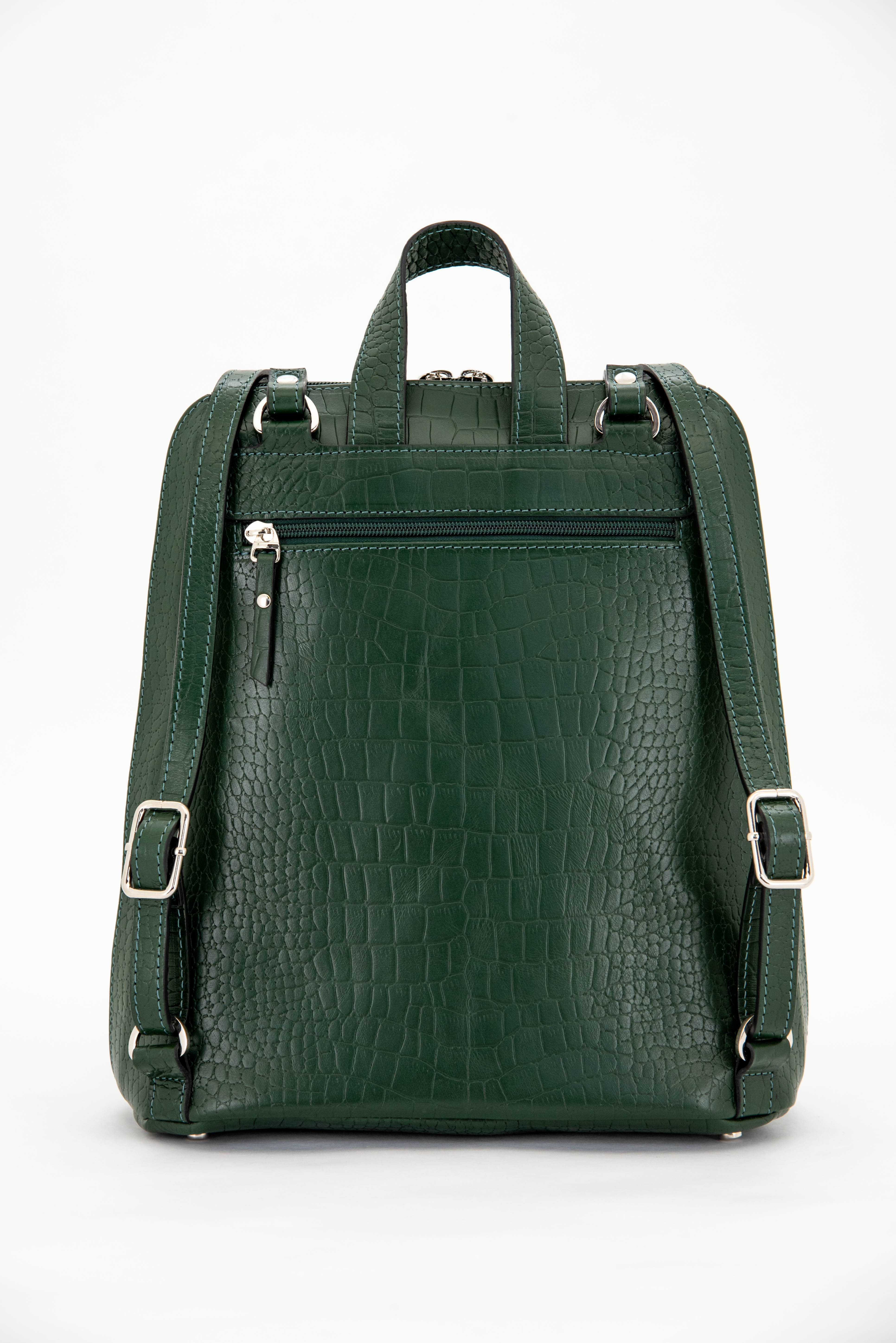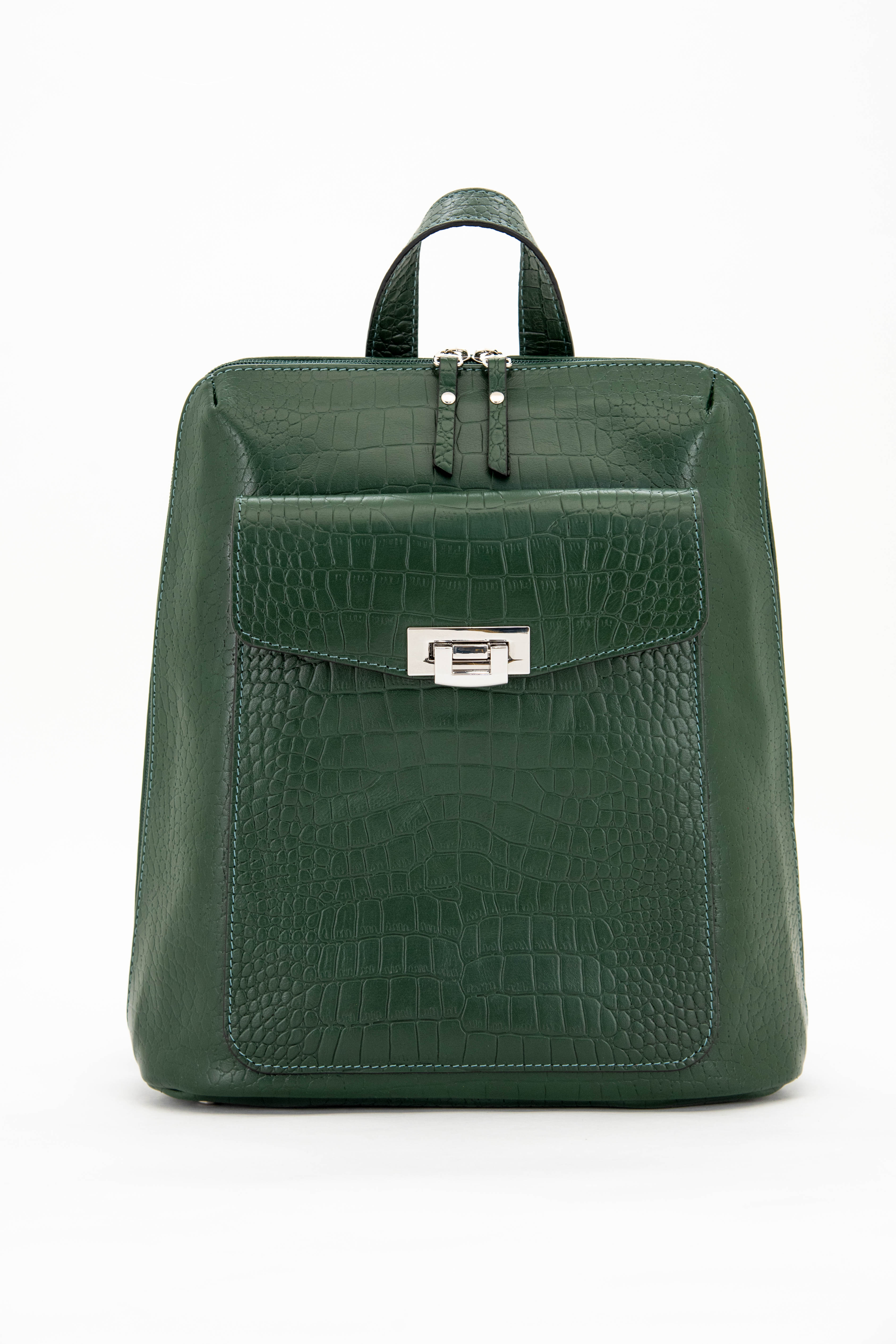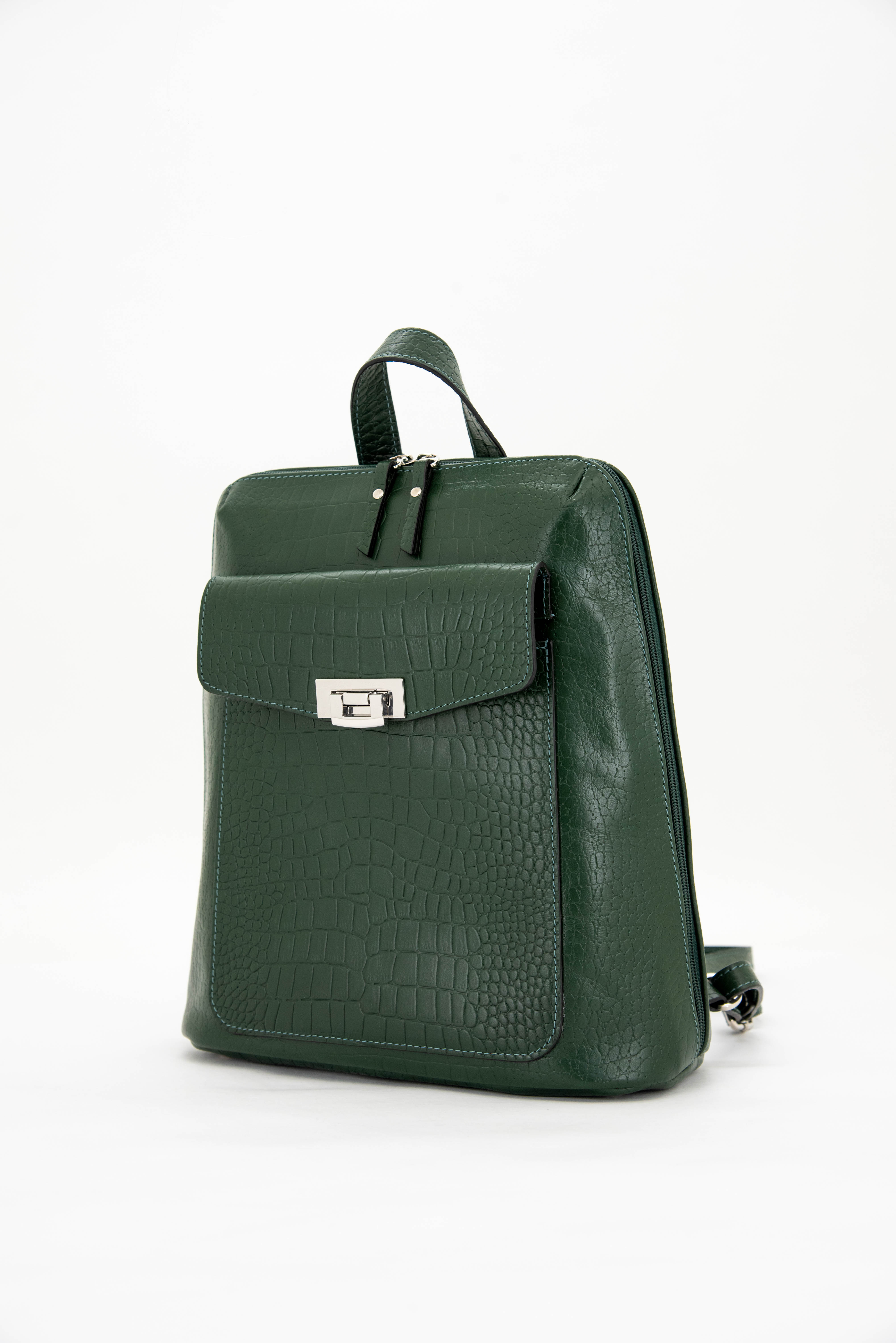 Сумка-рюкзак женская среднего размера. Сумка застегивается на молнию и имеет одно отделение. Лямки рюкзака регулируются по длине. На передней стенке расположен накладной карман с клапаном на металлическом замке. На задней стенке есть карман на молнии. Сумка-рюкзак на подкладке. Внутри сумка имеет средник на молнии из плотной материала, карман на молнии и накладной карман для мобильного телефона и визиток.