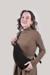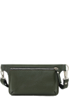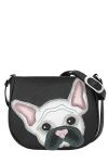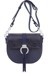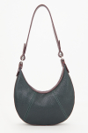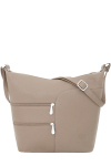 Сумка женская полукруглая с несъемным регулируемым ремнем через плечо. Сумка застегивается на клапан с магнитом и имеет одно отделение. Клапан имеет отделку из гладкой кожи с металлическим кольцом и завязкой из кожи. Ремень сумки также выполнен из гладкой кожи и декорирован металлическими цепями по бокам. На задней стенке расположен внутренний карман. Сумка на подкладке. Внутри сумки расположен карман на молнии и накладной карман для визиток и мелочей.