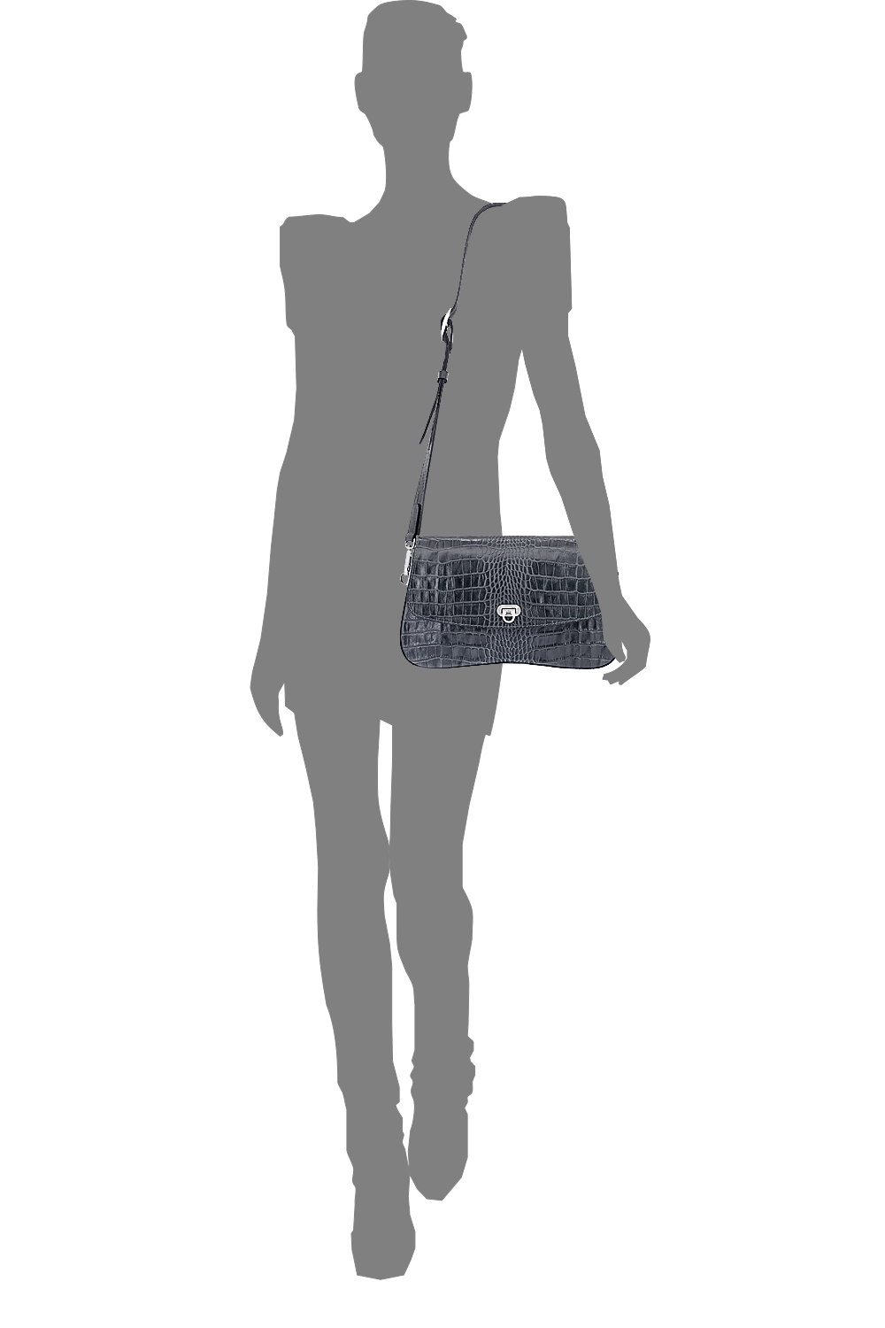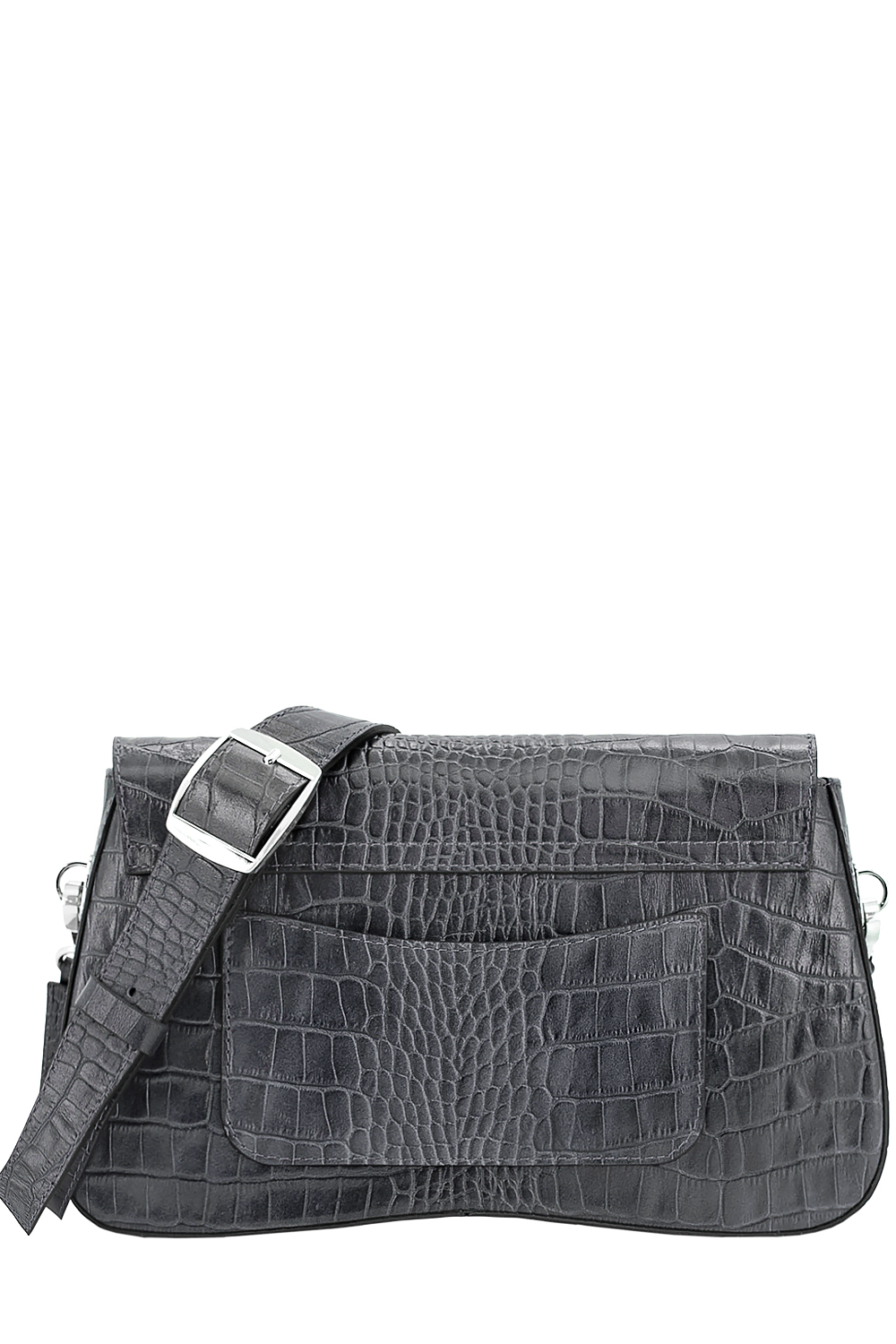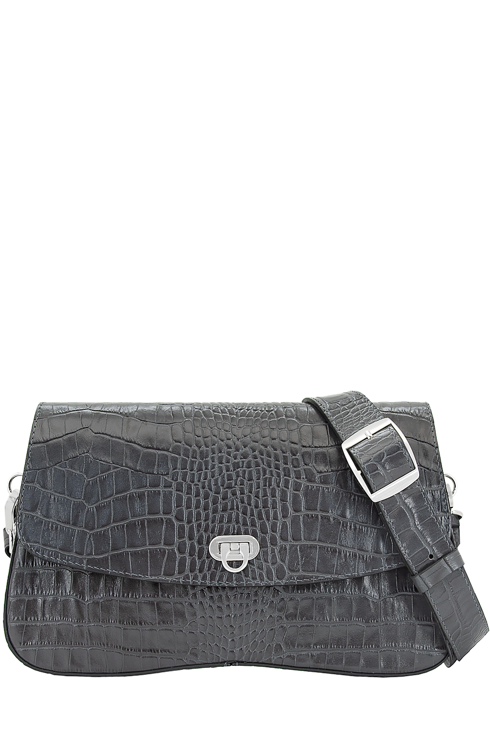 Сумка женская со съемным регулируемым ремнем через плечо. Сумка закрывается клапаном на замок и имеет одно отделение. На задней стенке открытый карман для банковских карт. Сумка на подкладке. Внутри сумки карман на молнии и накладной карман на молнии "карман в кармане".