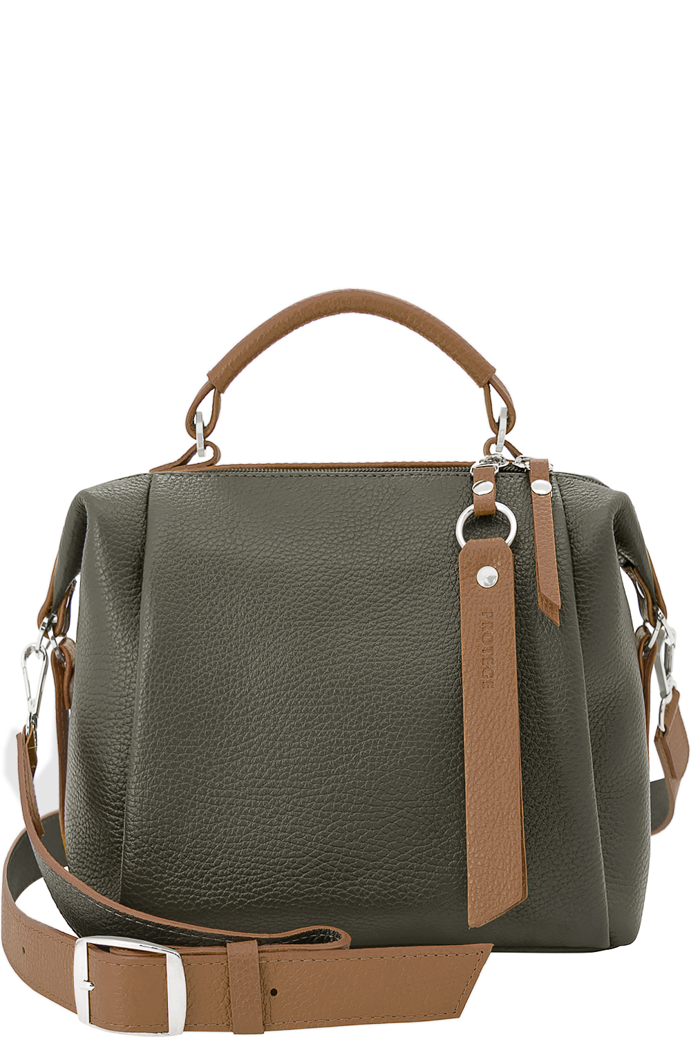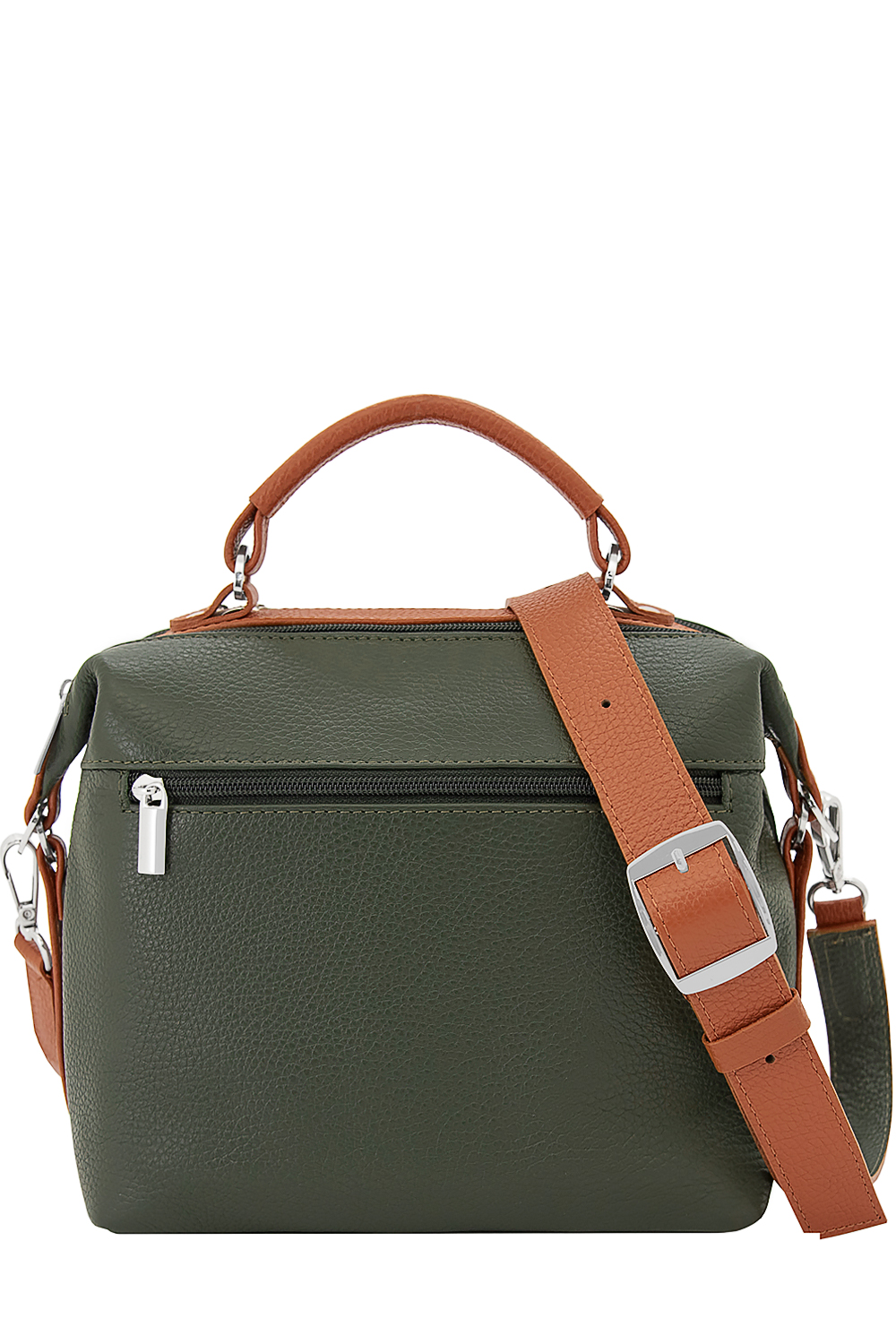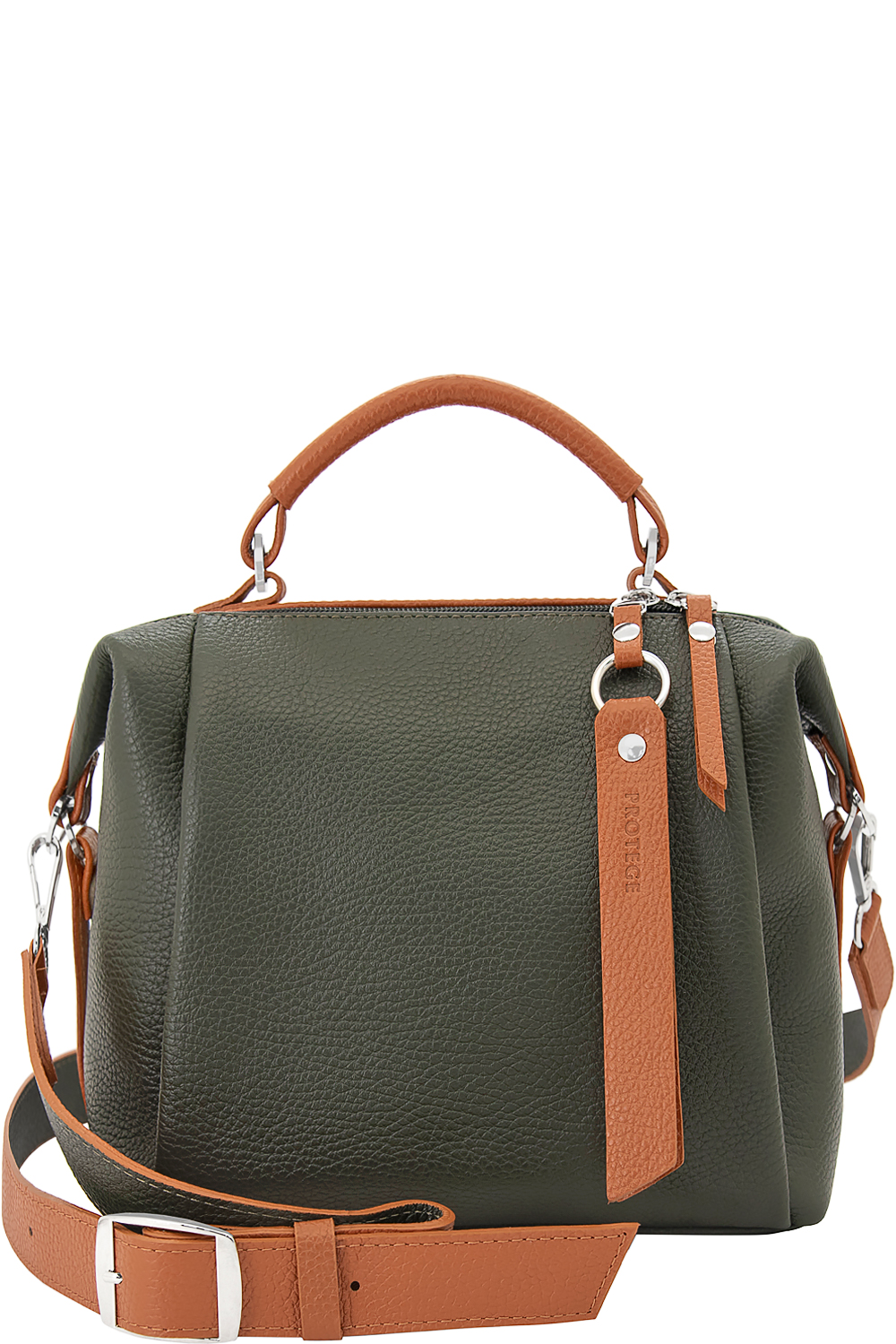 Сумка женская мягкой формы с короткой ручкой и съемным регулируемым ремнем через плечо. Сумка застегивается на молнию и имеет два отделения. На передней стенке расположены два внутренних кармана на молнии. На задней стенке также есть карман на молнии. Сумка на подкладке. Внутри сумка имеет карман на молнии и накладной карман для мобильного телефона и визиток.