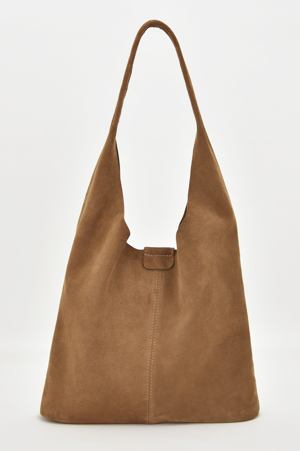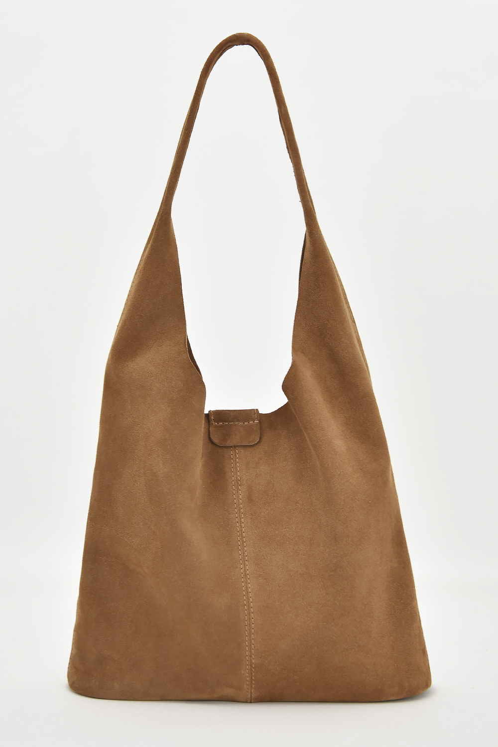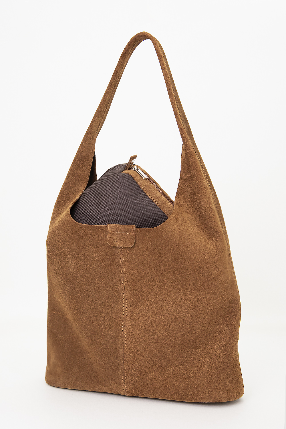 Сумка женская мягкой формы на плечо. Внутри — одно общее отделение, закрывается хлястиком на кнопке. Сумка без подкладки. Внутри: съёмная текстильная сумка, закрывается на молнию. Внутри отделения два открытых кармана и один карман молнии для ценных вещей.