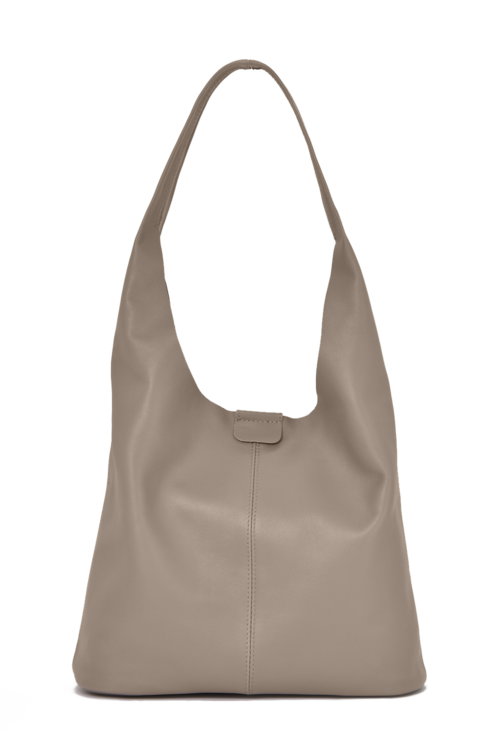 Сумка женская мягкой формы на плечо. Внутри — одно общее отделение, закрывается хлястиком на кнопке. Сумка без подкладки. Внутри: съёмная текстильная сумка, закрывается на молнию. Внутри отделения два открытых кармана и один карман молнии для ценных вещей.