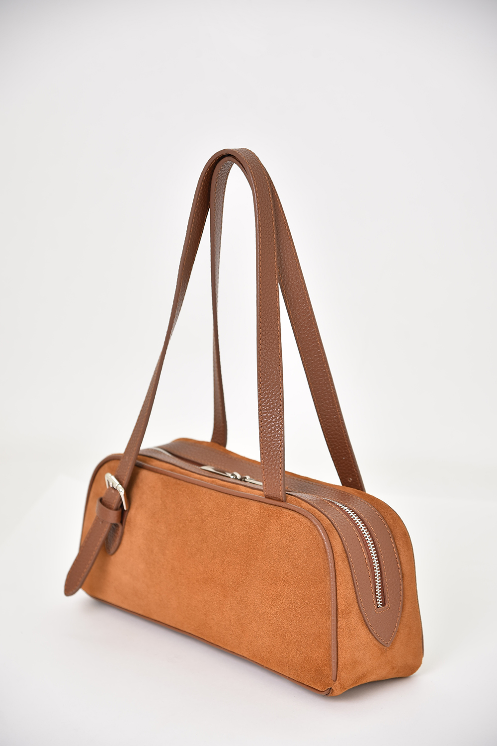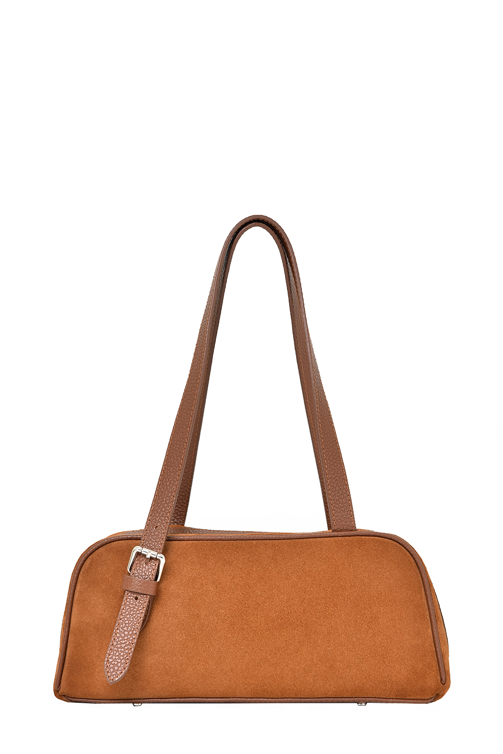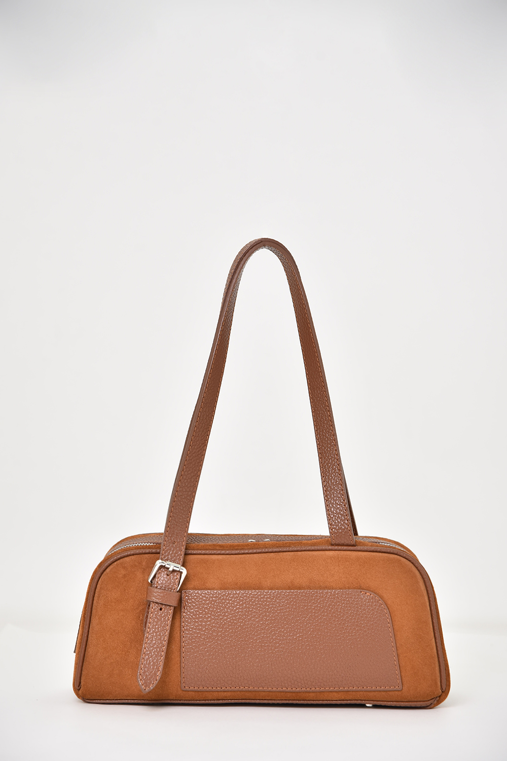 Сумка женская трапециевидной мягкой формы. Среднего размера. У сумки есть ручки, с регулируемой пряжкой. На задней стенке изделия расположен накладной карман. Сумка на подкладке. Имеет одно отделение. Внутри есть карман на молнии, и накладной карман.