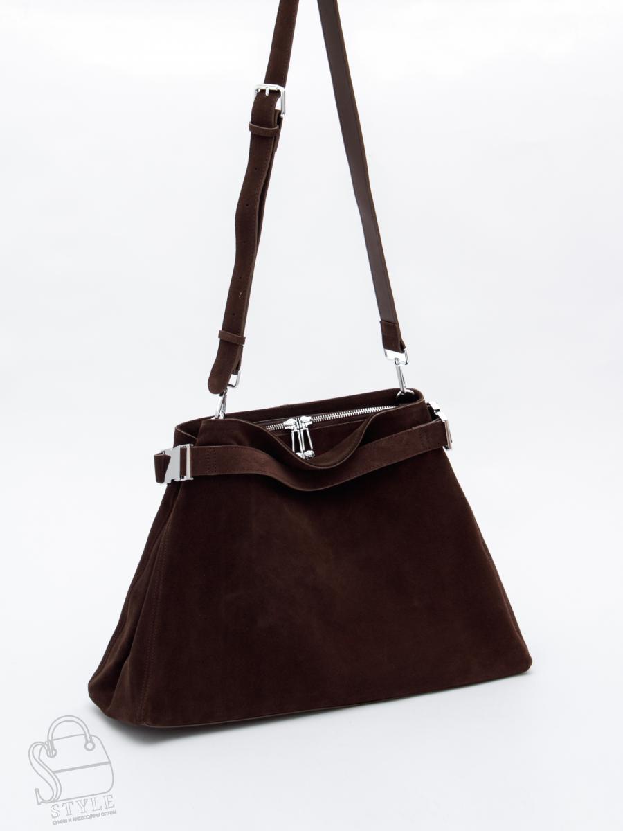 Трендовая модель, выполнена из замши. Дополнена серебристой фурнитурой. Данная модель закрывается на молнию. Каркас мягкий. Носится в  на плече. В комплекте имеется съемный ремень с регулировкой длины. По бокам имеются расширители.