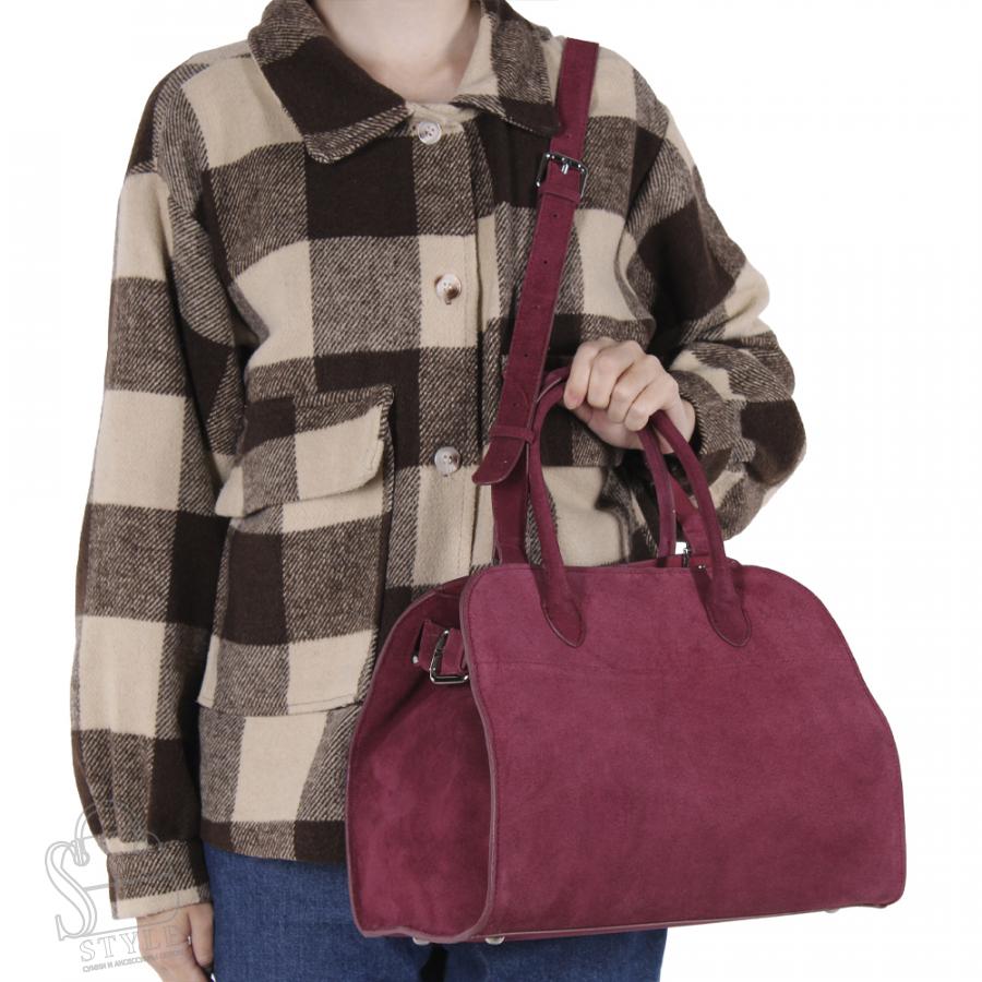 Модель бочонок, выполнена из натуральной замши. Дополнена серебристой фурнитурой. Данная модель закрывается на кнопку, носится в руке или на плече. В комплекте имеется ремень съемный с регулировкой длины и встроенные ручки. Каркас жесткий.