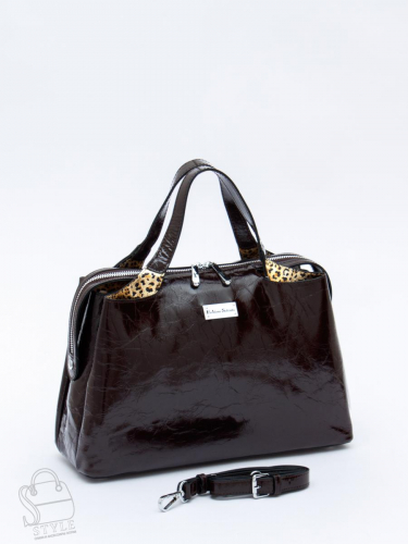 Базовая сумка, выполнена из натуральной лаковой кожи. Декорирована контрастными вставками. Дополнена серебристой фурнитурой. Данная модель закрывается на удлинённую молнию, которая фиксируется кнопками. Носится в руке за встроенные ручки или на плече за съемный ремень с регулировкой длины. Каркас полужесткий. На дне предусмотрены ножки.