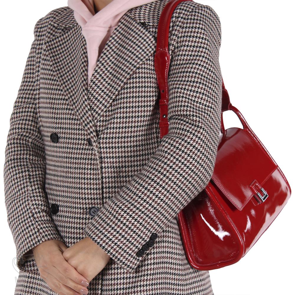 Стильная сумка, выполнена из натуральной лаковой кожи.  Дополнена серебристой фурнитурой. Данная модель закрывается на клапан, носится на плече или в руке. В комплекте имеется ремень с регулировкой длинны и короткая ручка встроенная. Каркас полужесткий.