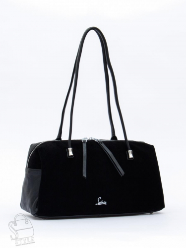 Вместительная модель, выполнена из замши и лаковой кожи. Декорирована бантом на передней части. Дополнена серебристой фурнитурой.  Данная модель закрывается на молнию. Носится  в руке за встроенные ручки или на плече за съемный  ремень с регулировкой длины. Каркас полужесткий. На дне предусмотрены ножки.