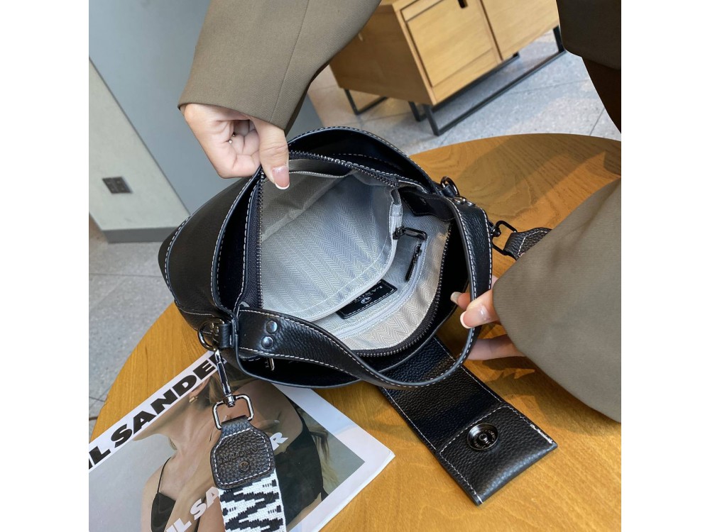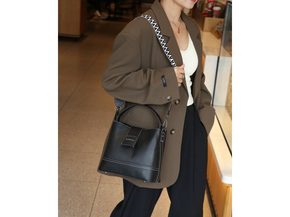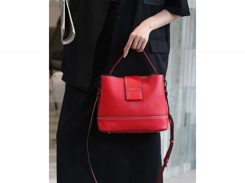 Одна короткая ручка. Текстильный ремень на плечо + длинный кожаный ремень с возможностью регулировки. Три основаных отделения. Одно застегивается на молнию, внутри перегородка в виде кармана на молнии, так же карман для телефона и дополнительный карман для аксессуаров на молнии. Два других отделения застегиваются на магнитную клепку.