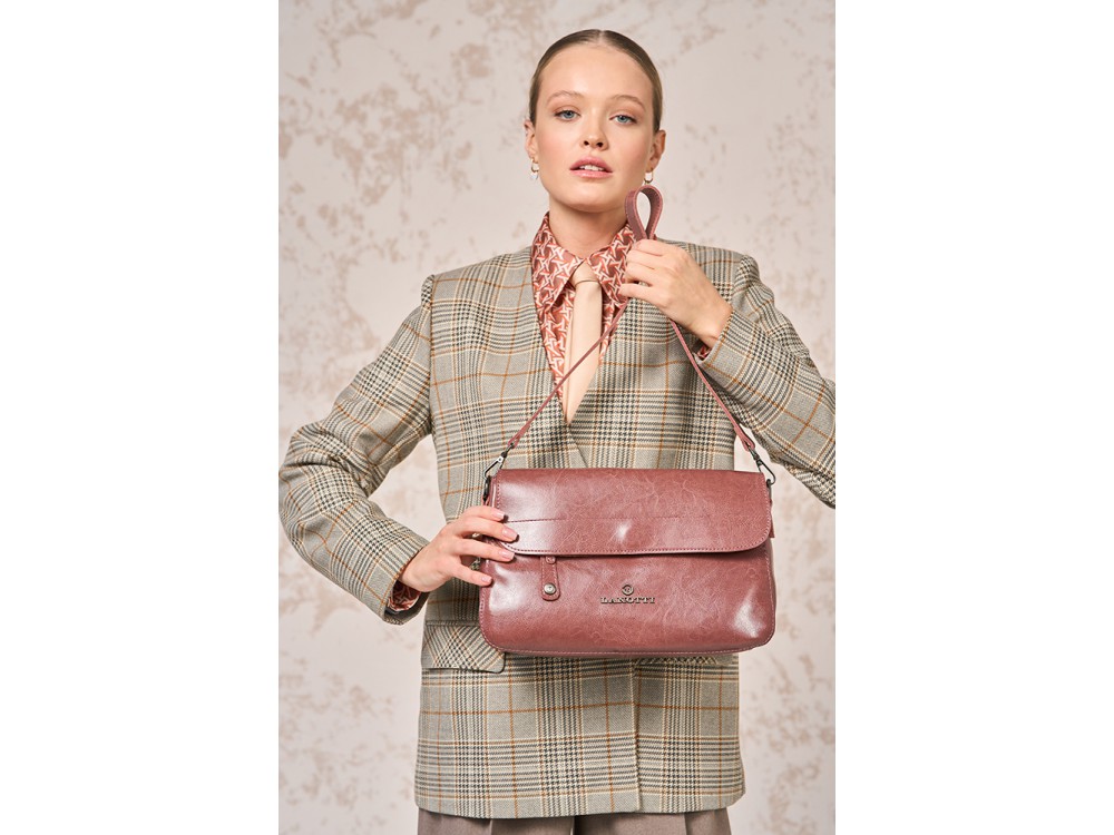 Два ремня,  короткий и длинный с возможностью регулировки. Внутри: два больших отделения с перегородкой в виде кармана на молнии, два кармана для аксессуаров, одно из которых на молнии. Снаружи: спереди карман на молнии. Сзади отделение для мелочей на молнии.