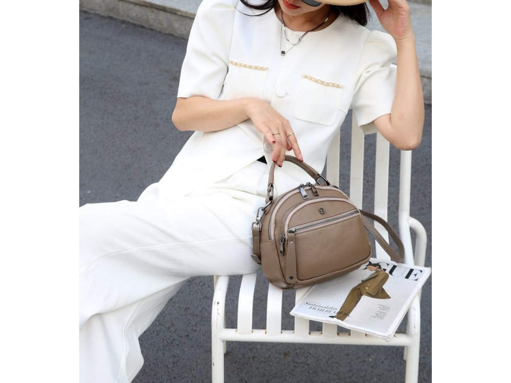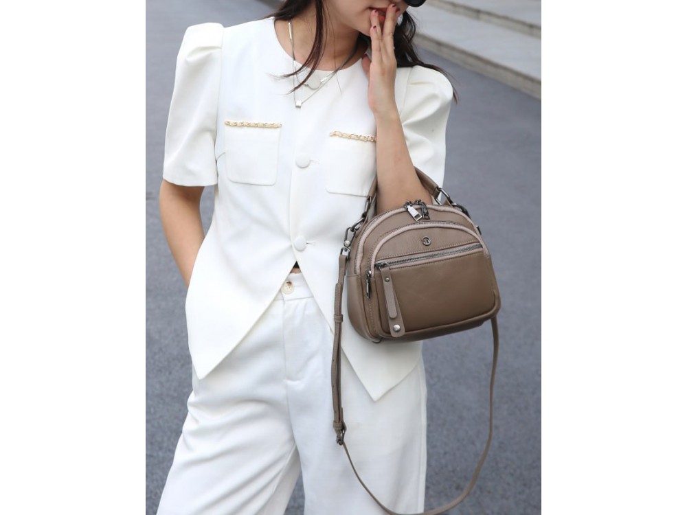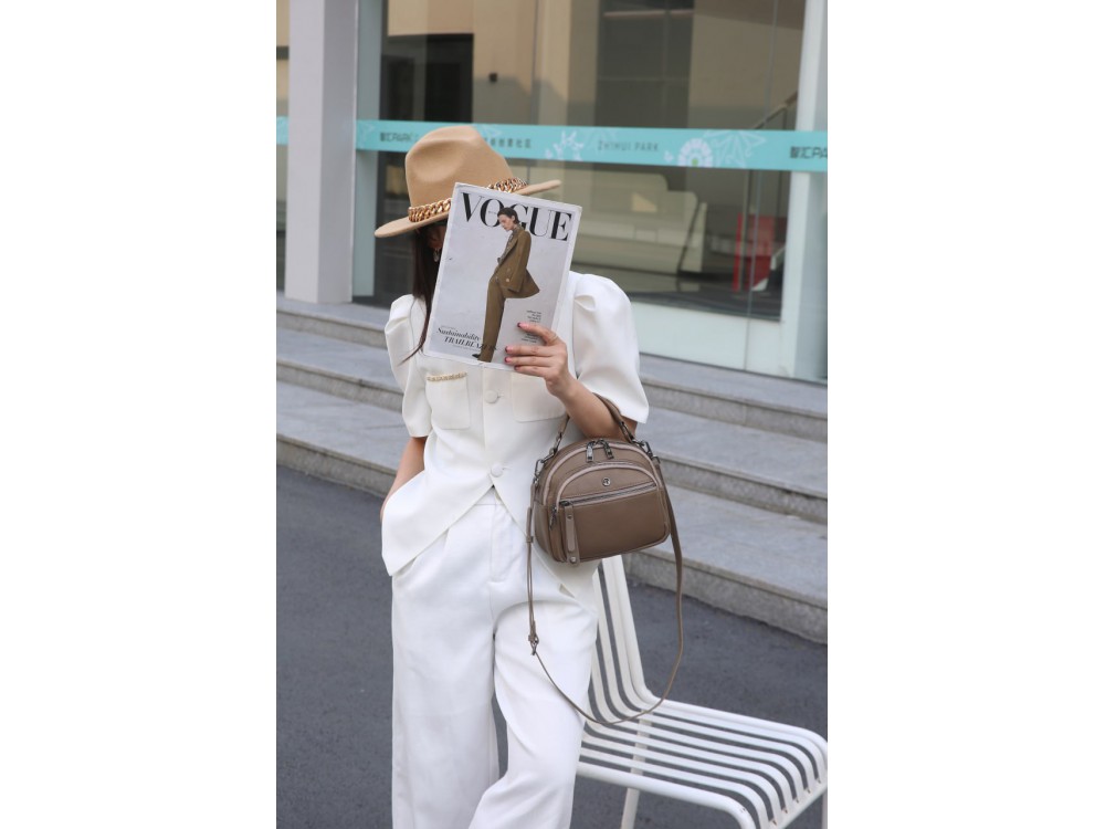 Короткая ручка и два ремня, текстильный ремень и кожаный с возможностью регулировки. Одно основное отделения на молнии. Внутри: два кармана один из которых на молнии. Снаружи: спереди накладной вместительный отдел на молнии, дополнительный карман для акссесуаров на молнии. Сзади: карман для мелочей на молнии.