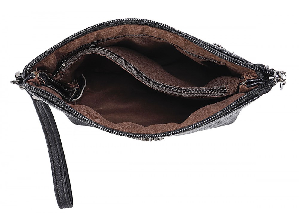 Два основных отделения. Внутри центральный карман на молнии и дополнительный внутренний карман на молнии для мелочей. Сумка хорошо держит форму.