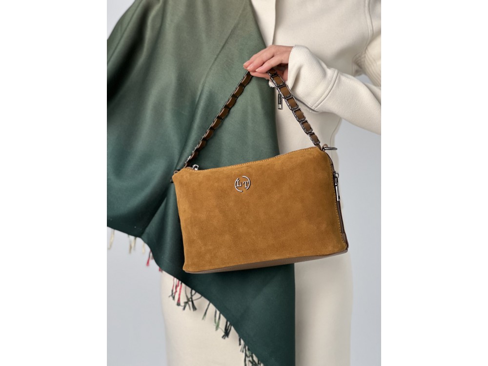 Сумка женская из натуральной кожи, лицевая часть которой обшита замшей. Данная модель имеет регулируемый ремень из натуральной кожи. Внутри 2 основных отделения с карманами для мелечей, которые разделяет отдел на молнии. По бокам сумки расположены карманы на молнии.