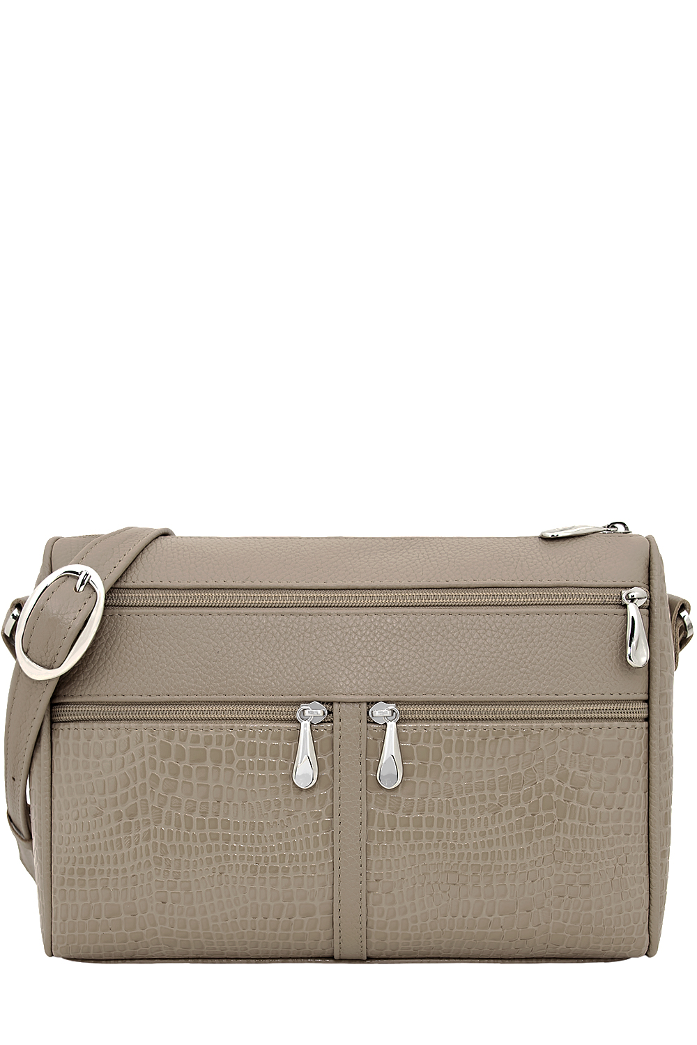 Сумка женская среднего размера с несъемным регулируемым ремнем через плечо. Сумка застегивается на молнию и имеет одно отделение. На передней стенке расположены один большой верхний карман на молнии и два маленьких нижних кармана на молнии. На задней стенке также есть карман на молнии. Сумка на подкладке. Внутри сумка имеет карман на молнии, накладной карман для мобильного телефона и визиток.