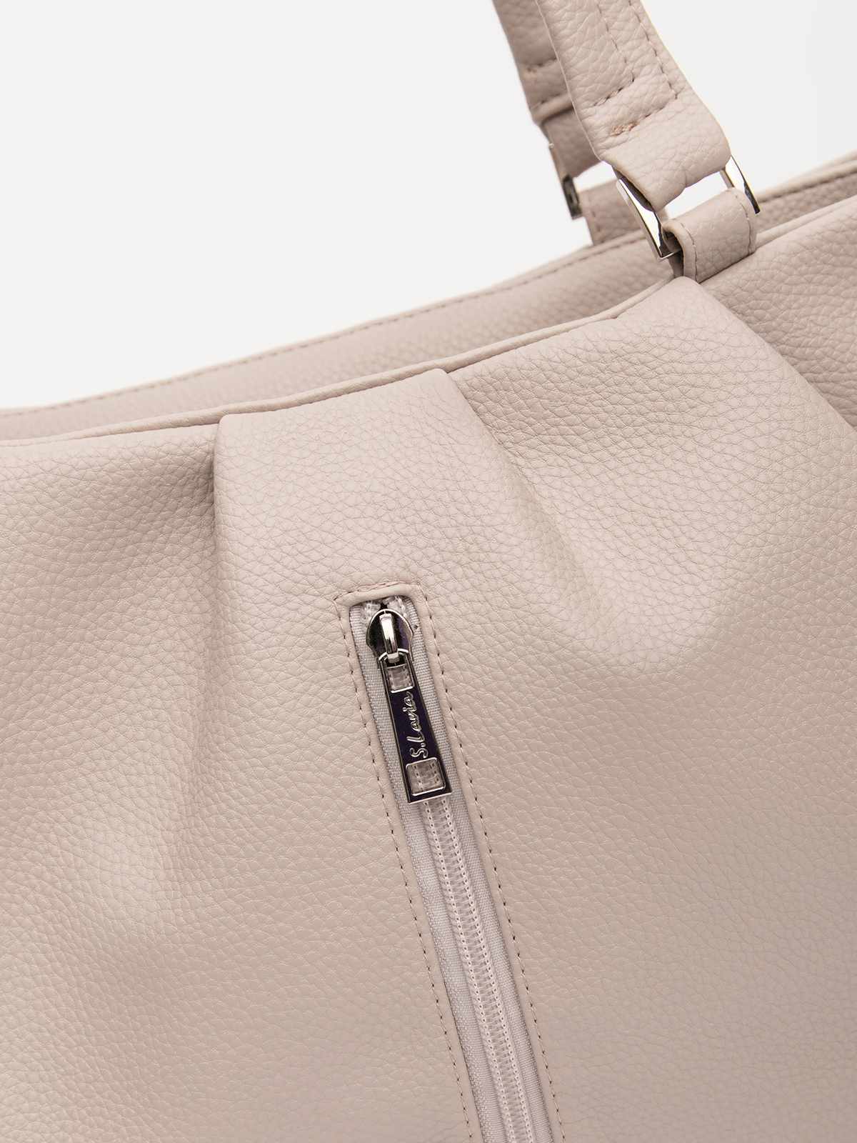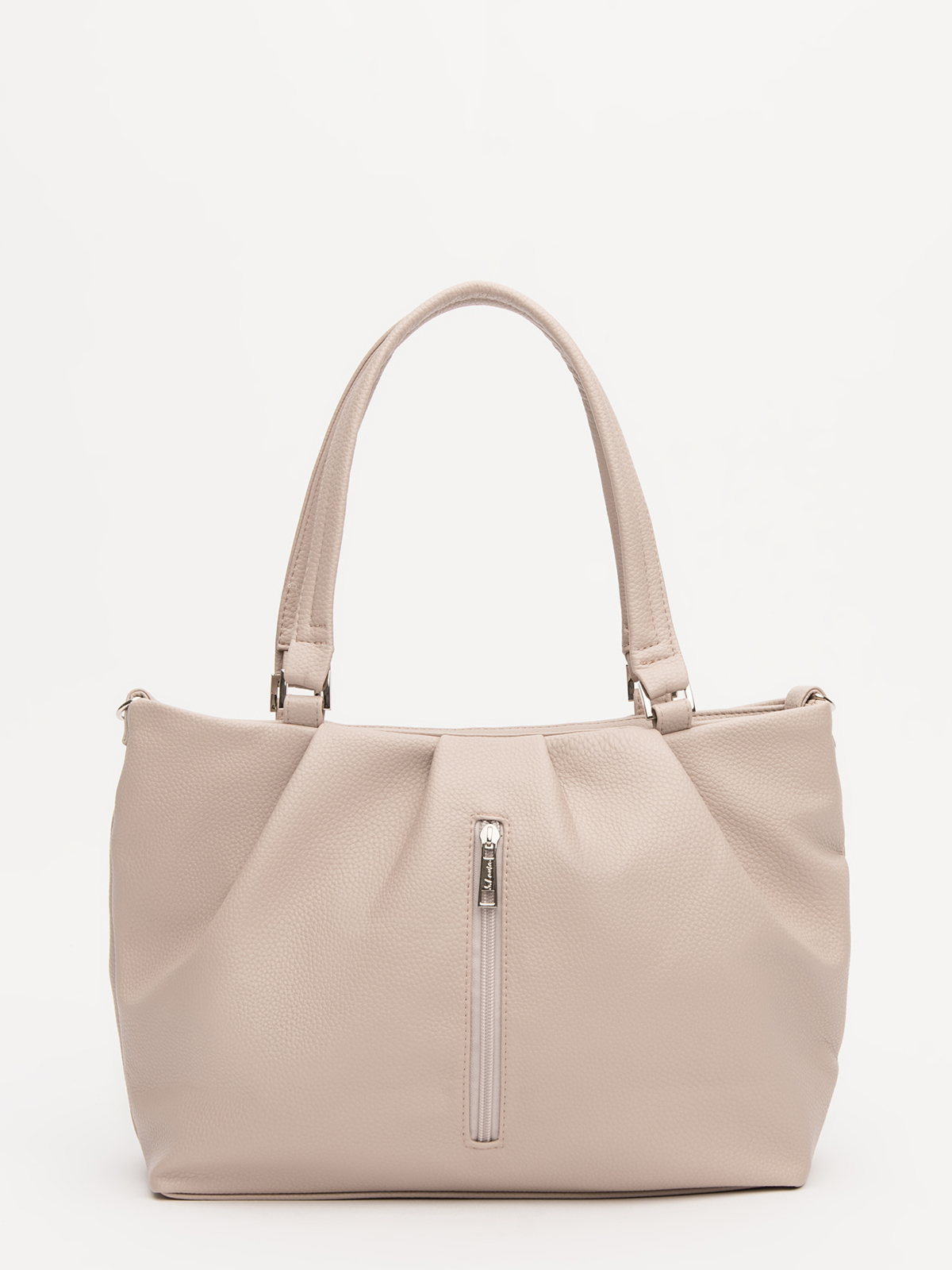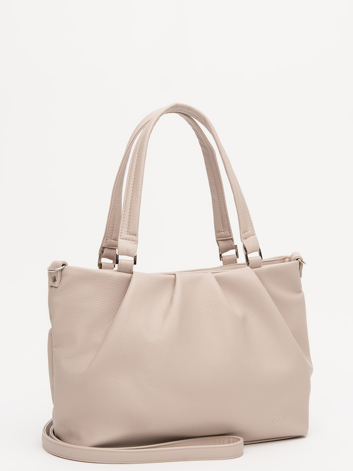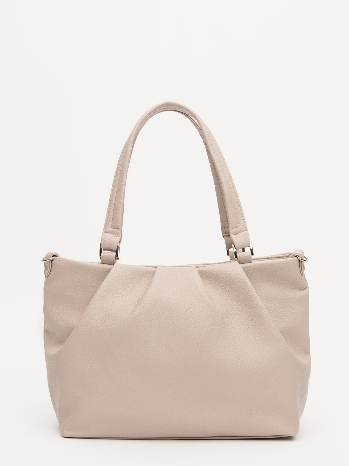 Трендовый силуэт вытянутого прямоугольника со стильными складками создаёт дополнительный объём и добавляет образу лёгкую женственность. Удобные ручки средней длины и съёмный ремень предлагают варианты ношения — от классического до более свободного. Литой декор и брендированная фурнитура подчёркивают статусность аксессуара.