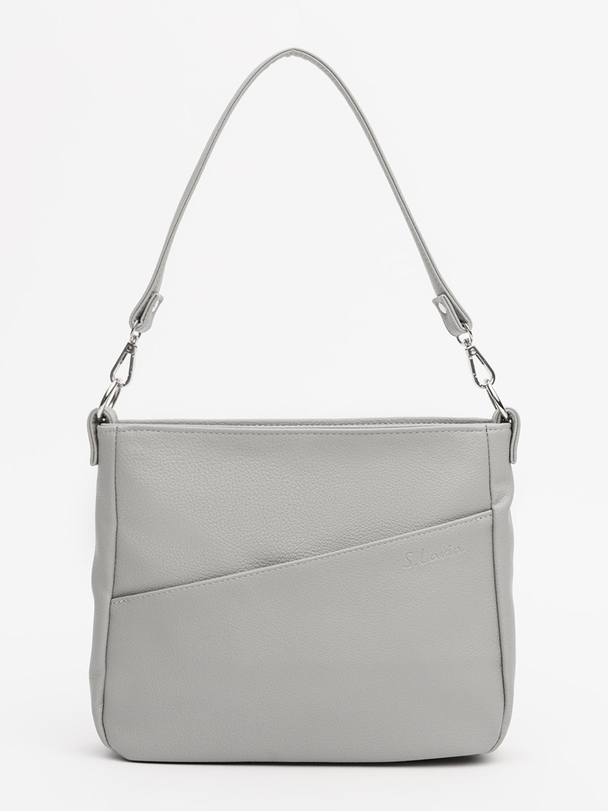 Геометричная форма с диагональным карманом и естественной складкой верха создаёт стильный женственный силуэт. В комплекте — съёмная короткая ручка и регулируемый ремень для разных вариантов ношения: в руке, на плече или через плечо.
