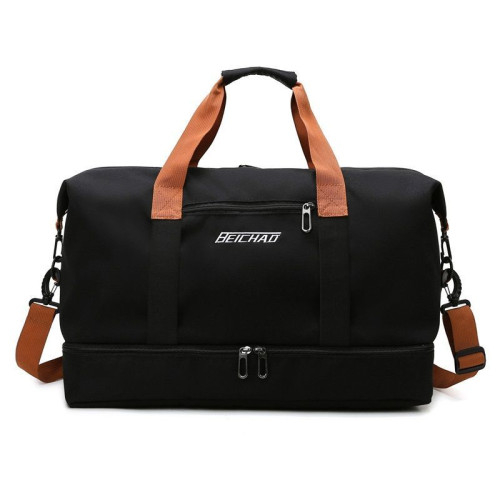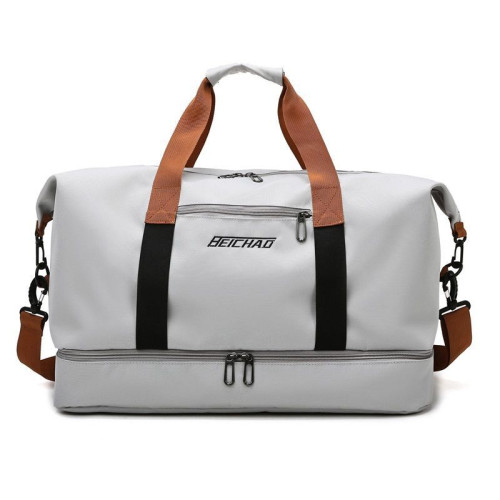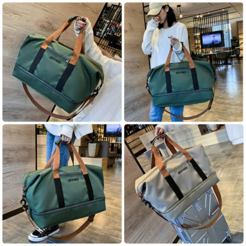 Внутри: одно большое вместительное отделение с карманами на молнии и без для телефона, документов и различных мелочей. У сумки есть отдельное водонепроницаемое отделение для влажных вещей. Сумка держит форму и закрывается на встречную молнию. Внизу у сумки есть отдельный отсек для обуви, который так же закрывается на встречную молнию. В комплекте широкий прочный ремень, регулируемый по высоте. На внешней передней части сумки расположен карман на молнии. На внешней задней стенке есть лямка для крепления сумки на тележку или туристический чемодан на колёсах. Ручки и ремень сумки позволяют носить её в руке, на запястье, на локте, на плече и через плечо.