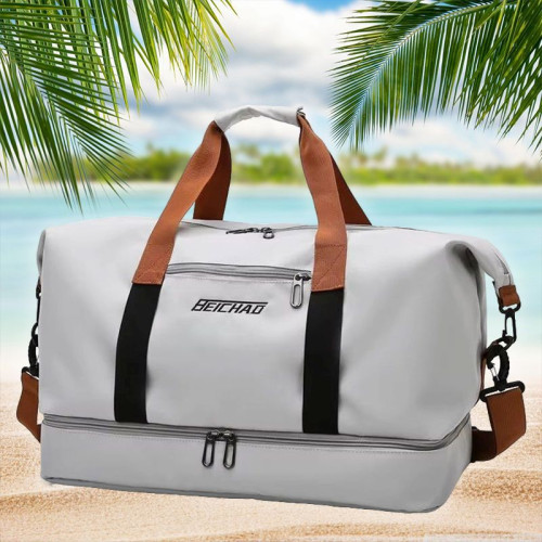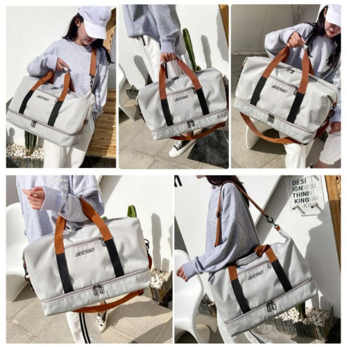Внутри: одно большое вместительное отделение с карманами на молнии и без для телефона, документов и различных мелочей. У сумки есть отдельное водонепроницаемое отделение для влажных вещей. Сумка держит форму и закрывается на встречную молнию. Внизу у сумки есть отдельный отсек для обуви, который так же закрывается на встречную молнию. В комплекте широкий прочный ремень, регулируемый по высоте. На внешней передней части сумки расположен карман на молнии. На внешней задней стенке есть лямка для крепления сумки на тележку или туристический чемодан на колёсах. Ручки и ремень сумки позволяют носить её в руке, на запястье, на локте, на плече и через плечо.